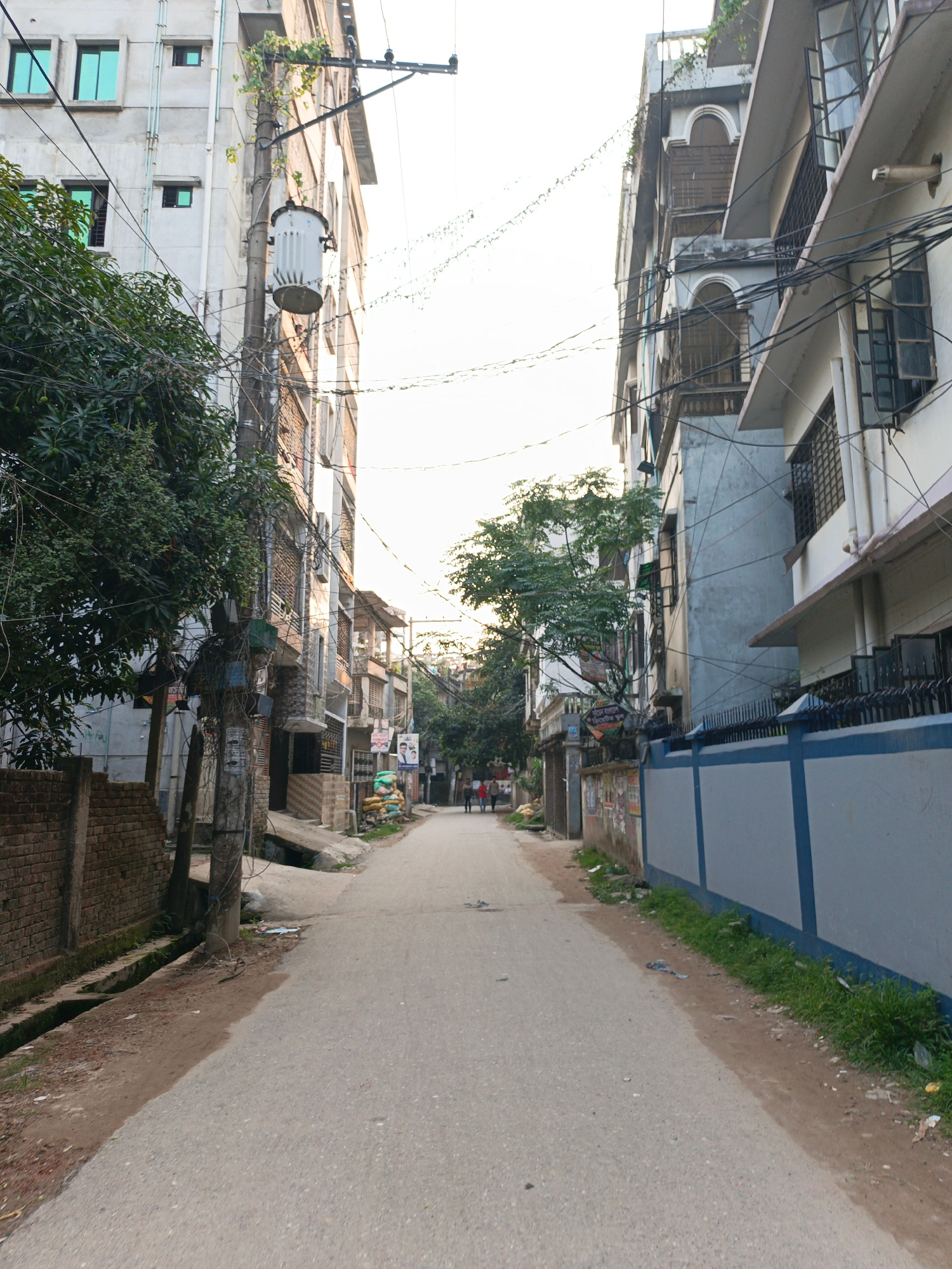 The image shows a street in Nobinagar, Bangladesh. The street is narrow and paved, with buildings on either side. On the left side of the street, there is a brick wall and a concrete utility pole with…read more