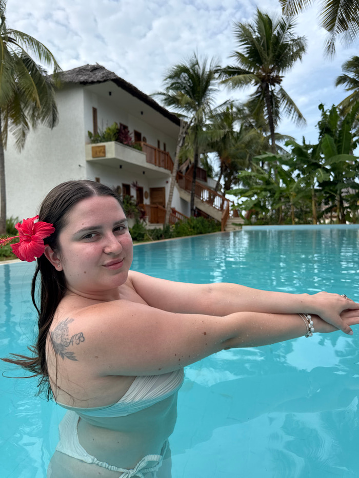 The image displays a female partially submerged in an outdoor swimming pool at a resort in Zanzibar, Tanzania. The woman, with dark hair and fair skin, has a red hibiscus flower tucked behind her left…read more