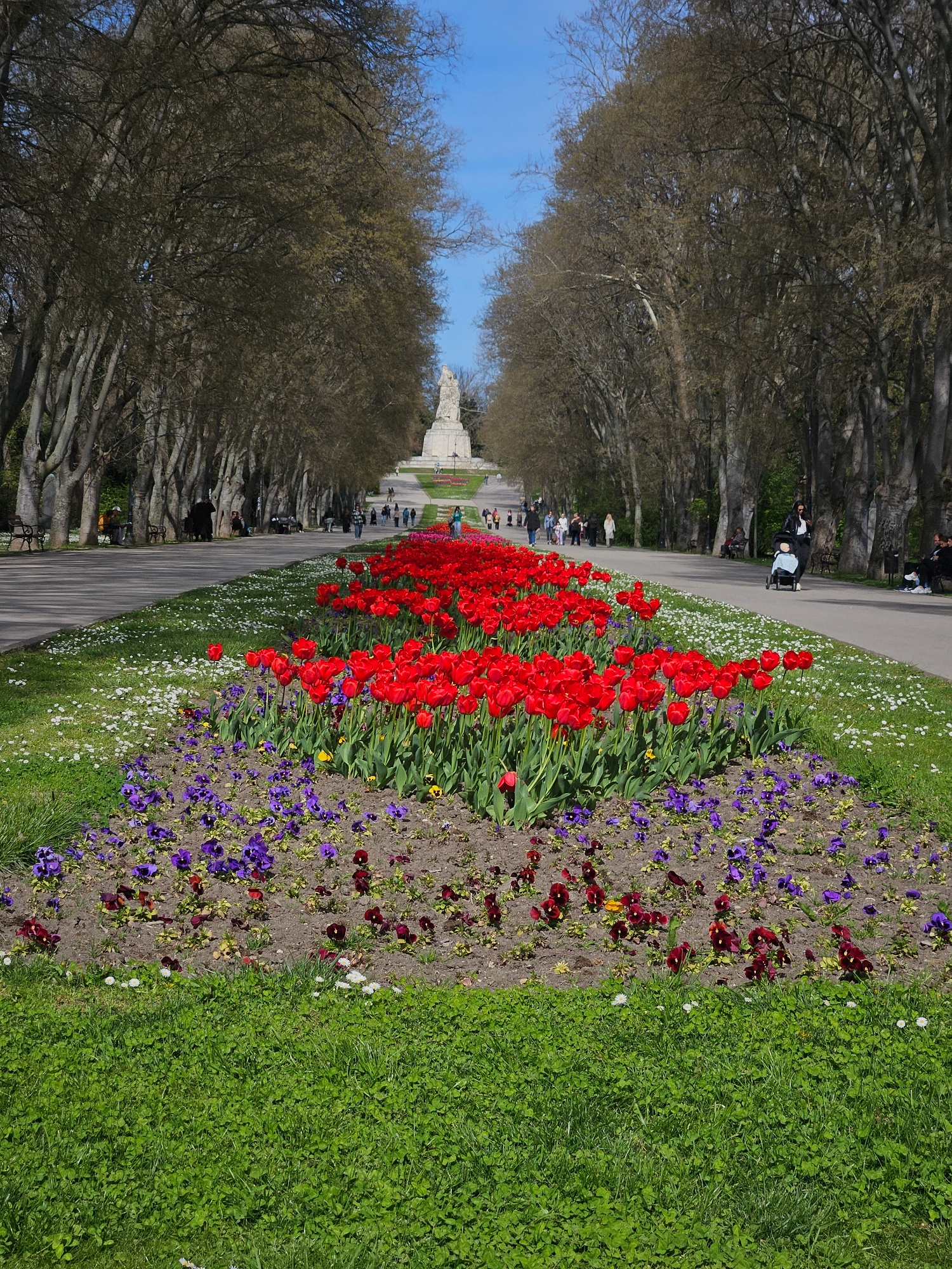 This image presents a serene view of a wide, tree-lined avenue within a park, likely in Varna, Bulgaria. The central feature is a paved path extending into the distance, leading towards a prominent wh…read more