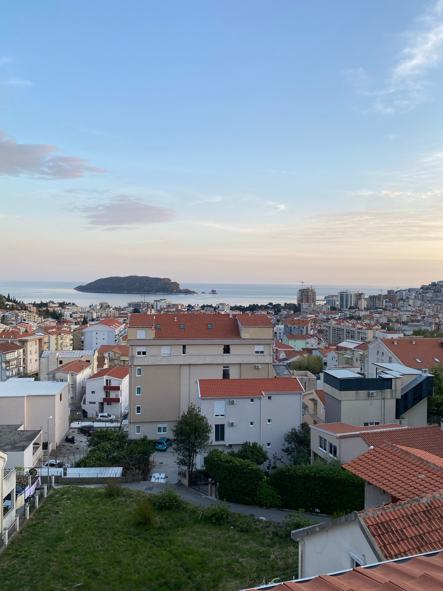 Here is a description of the image: The image depicts a coastal cityscape, most likely Budva, Montenegro, during either sunrise or sunset. The sky is a gradient of light blue and pale orange, indicat…read more