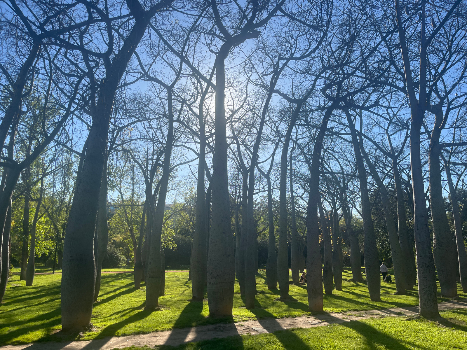 The image captures a serene park scene in Valencia, Spain, dominated by numerous large, deciduous trees with distinctive, thick, greyish-green trunks that taper upwards, resembling bottle trees or Cho…read more