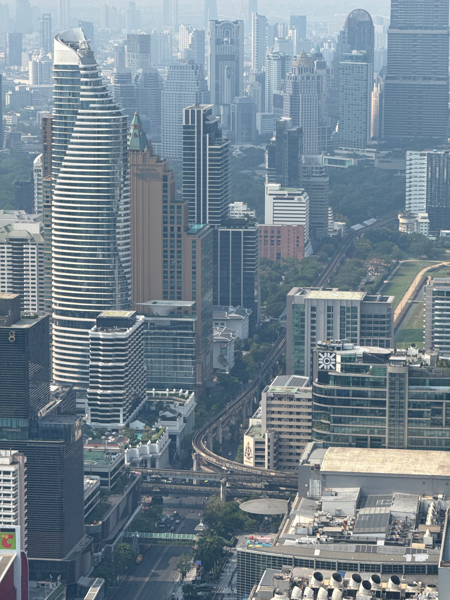 The image shows an aerial view of Bangkok, Thailand. It is taken from a high vantage point and shows a dense cityscape with numerous high-rise buildings. Many buildings have modern designs with vertic…read more