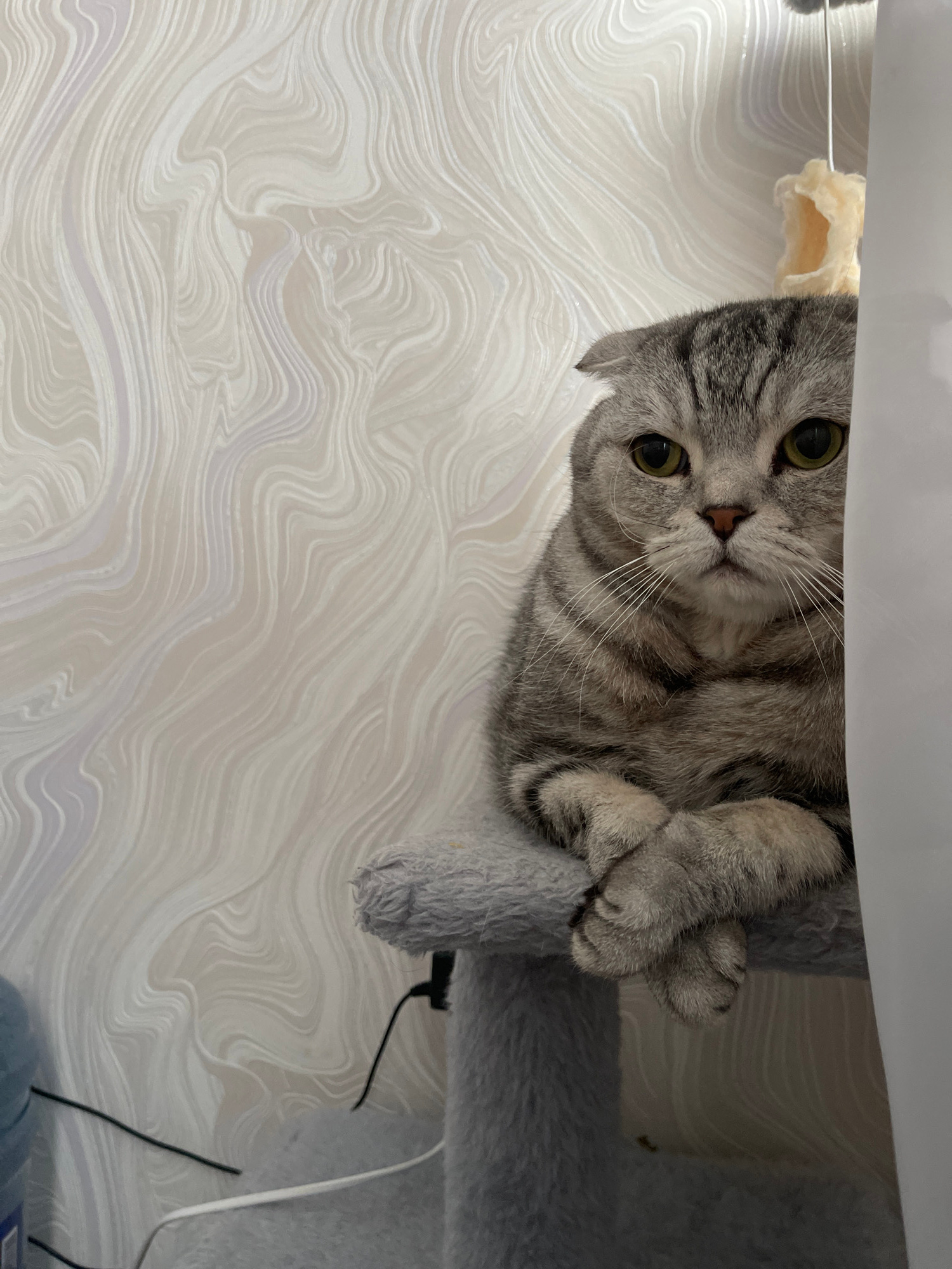 A Scottish Fold cat is perched on a gray, carpeted cat tree. The cat is facing the camera with its paws crossed. The background is a white wall with a swirling pattern. The image appears to be taken i…read more