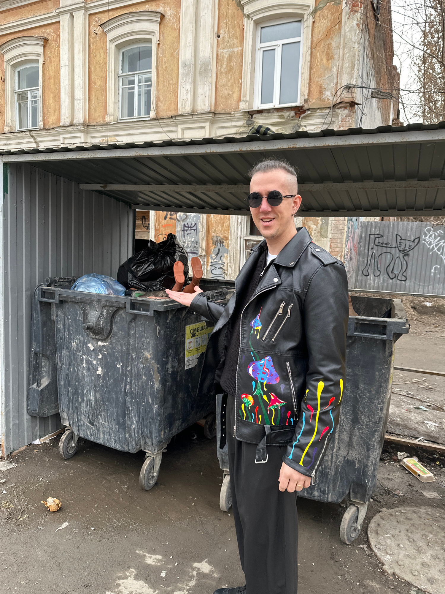 The image captures an adult male posing in an urban outdoor setting in Saratov, Russia. The man stands slightly left of center, facing the camera with a smile. He has short, light-colored hair with sh…read more