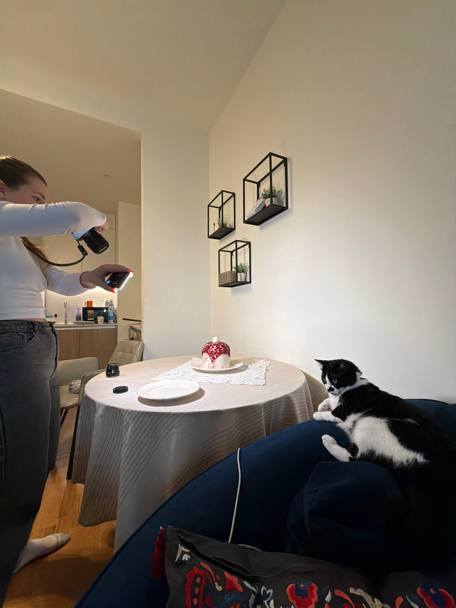 The image depicts an indoor scene in an apartment located in Belgrade, Serbia. A female individual, wearing a white long-sleeved top and dark gray jeans, stands on the left side of the frame. She hold…read more