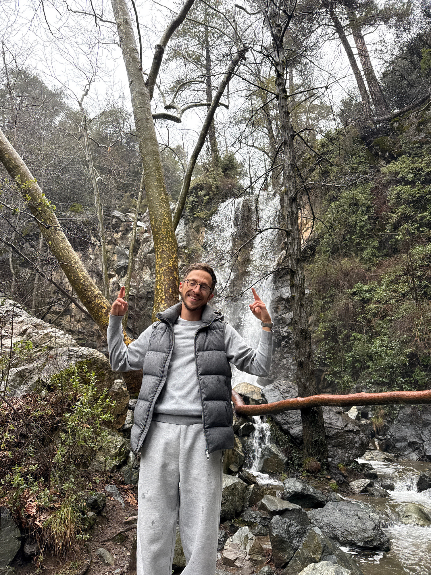 The image shows a man standing near a waterfall. The man is wearing a gray tracksuit and a gray puffer vest, and he is making a peace sign with both hands. The waterfall is surrounded by rocks and tre…read more