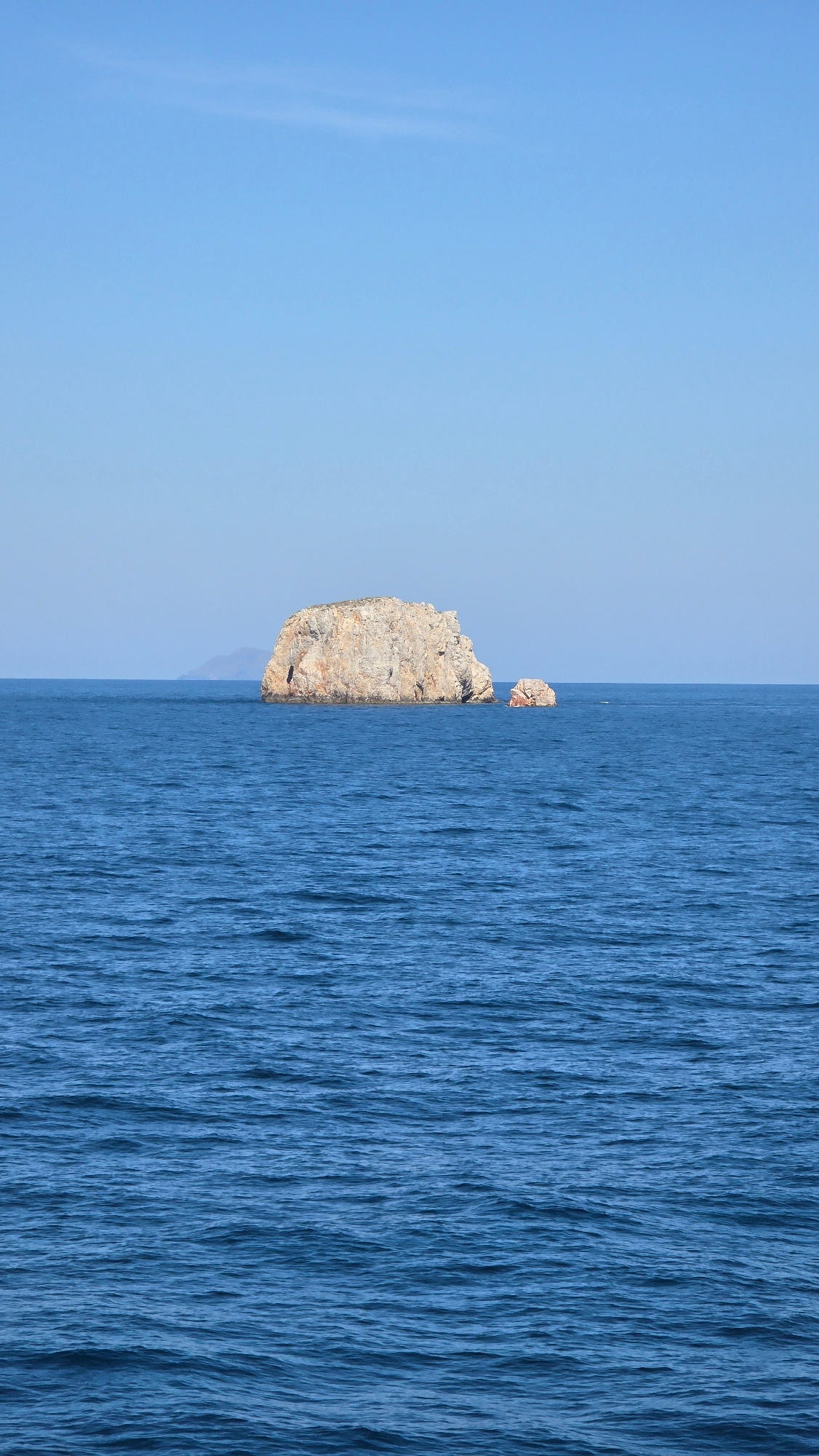 The image depicts a coastal scene, likely in an area of unknown, Greece. A rocky outcrop stands in the center, positioned between the sky to the left and the sea to the right. The sky is light blue wi…read more