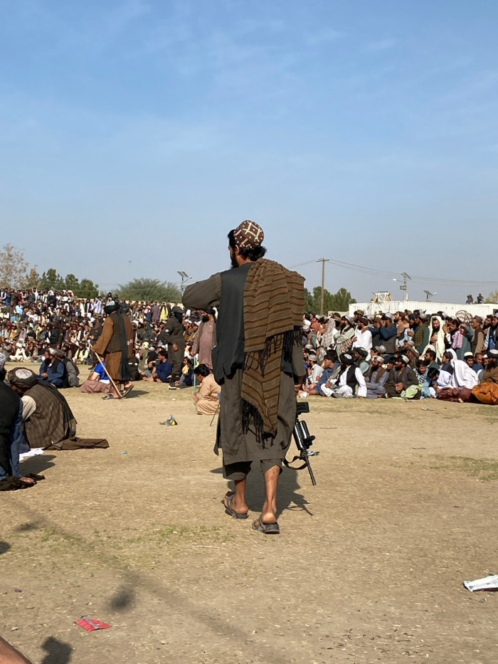 The image presents an open-air gathering of predominantly men in an unpaved, dusty field in Kandahar, Afghanistan. The central figure, viewed from behind, walks away from the camera in the mid-ground.…read more