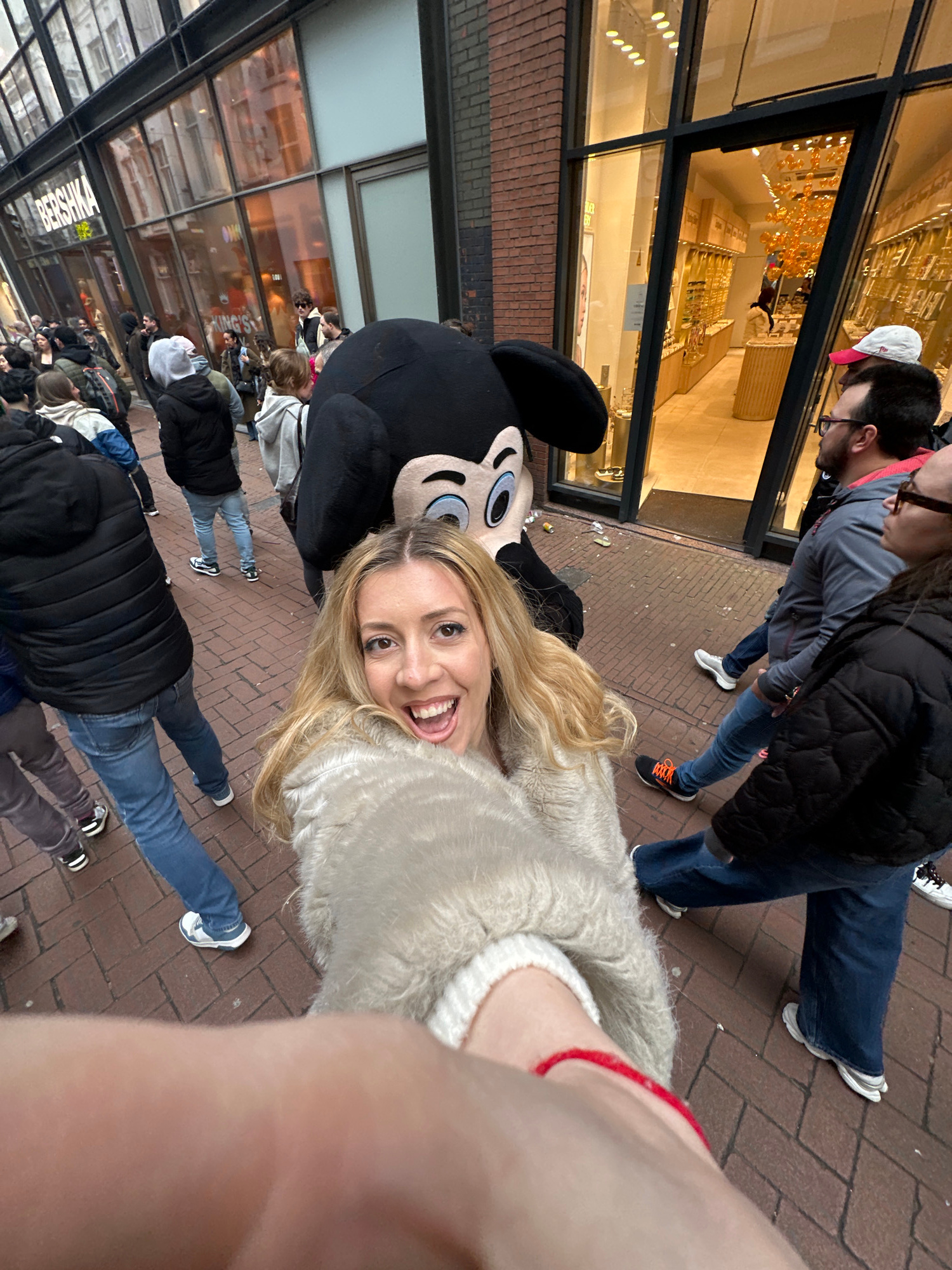 A distorted, wide-angle, low-angle selfie captures a woman with long blonde hair, wearing a fuzzy white sweater, smiling while posing with a Mickey Mouse mascot on a brick sidewalk, with a group of pe…read more