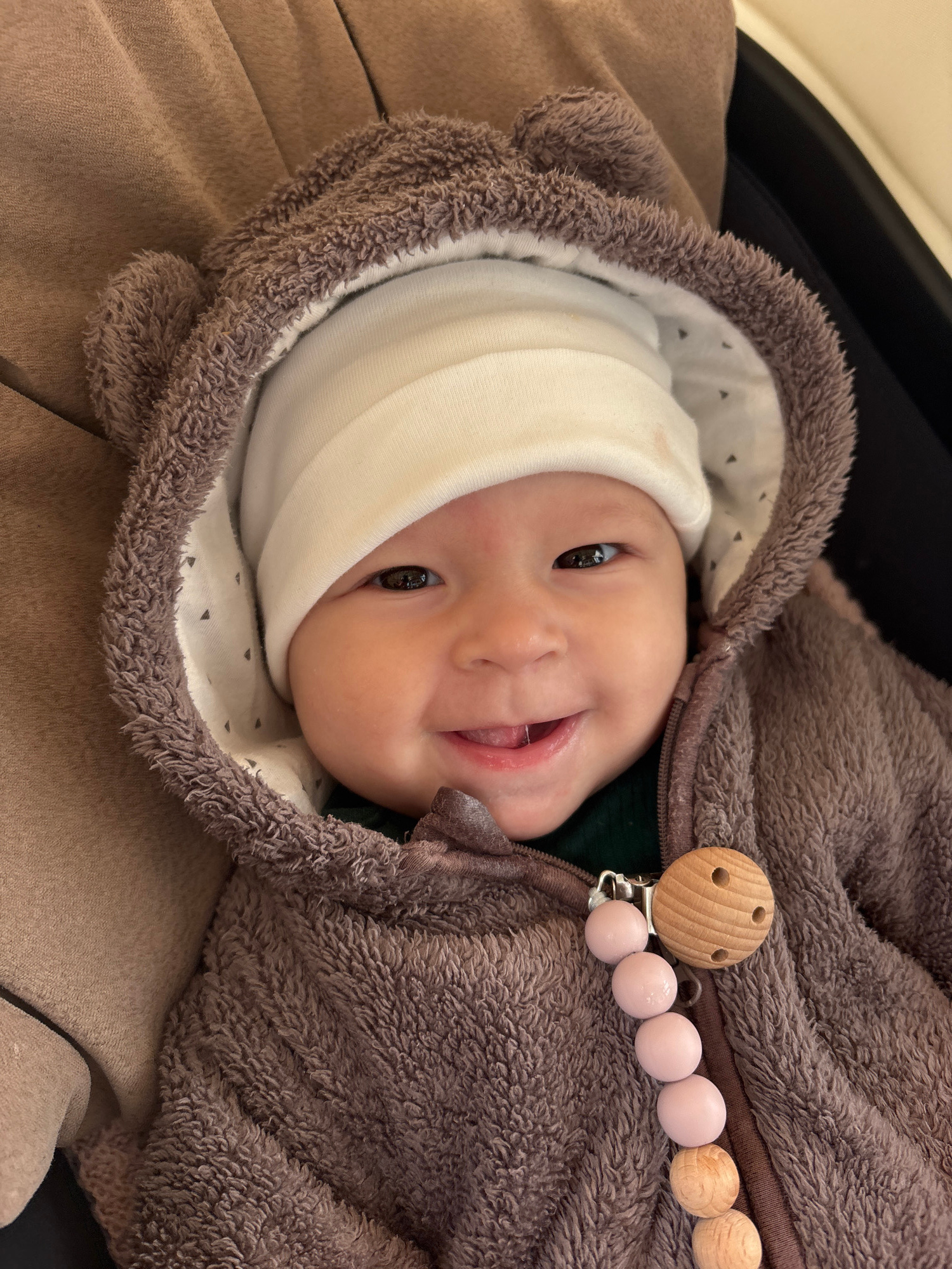 A baby wearing a white cap and brown furry hooded jacket lies on a brown surface. A pacifier clip with light pink and wooden beads is attached to the jacket. The location is not identifiable as Sochi, Russia. | Open Wire