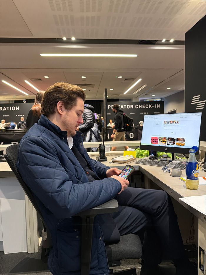 A man in a navy quilted jacket sits at a desk, looking at his smartphone. Behind him, other people queue at a "Spectator Check-In" station. A computer monitor displays a social media page, and various…read more