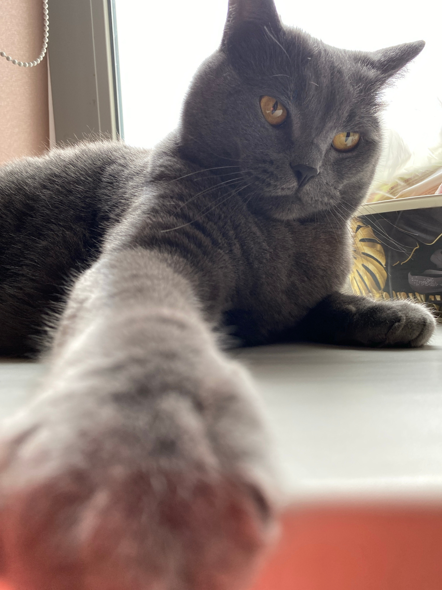 A gray cat with yellow eyes is partially visible. The cat's head is tilted. One of the cat's paws is extended towards the camera. The cat is holding onto a white wall with its paw. The background incl…read more