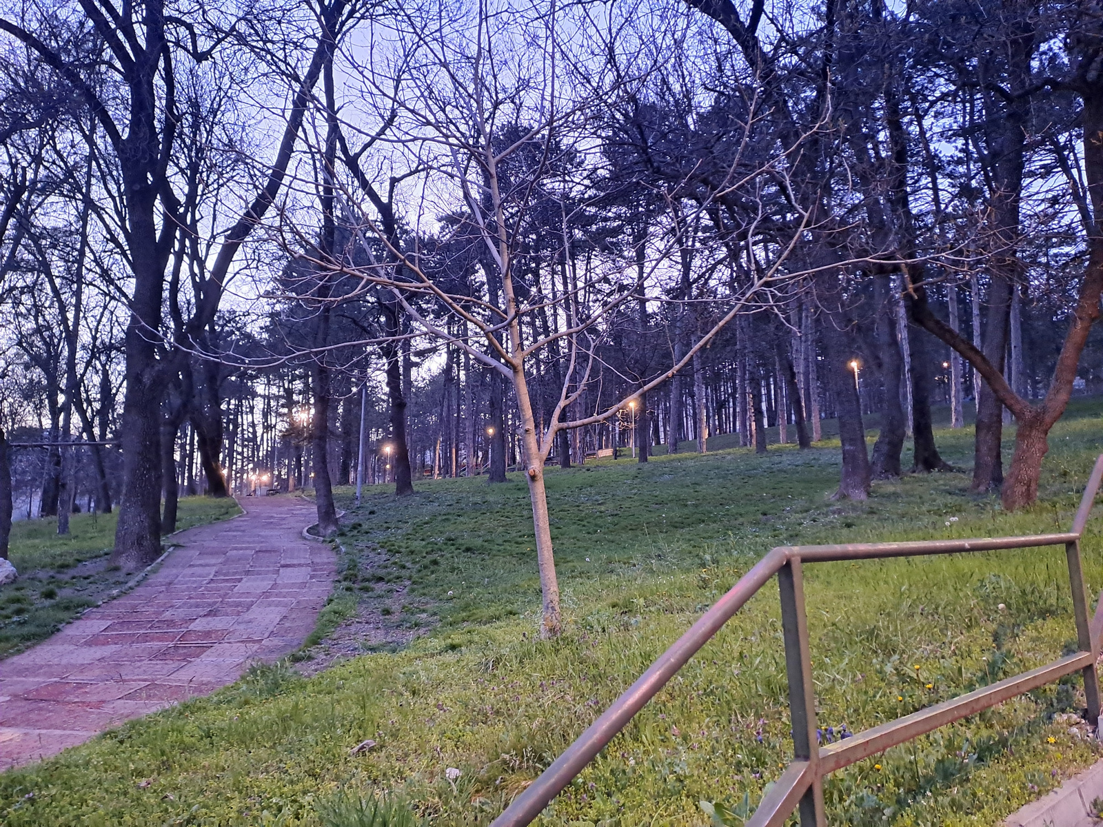 The image depicts a park scene, possibly in Veliko Tarnovo, Bulgaria. A paved brick pathway curves through the landscape, lined with mature trees, some with bare branches. Beyond the path, the park as…read more
