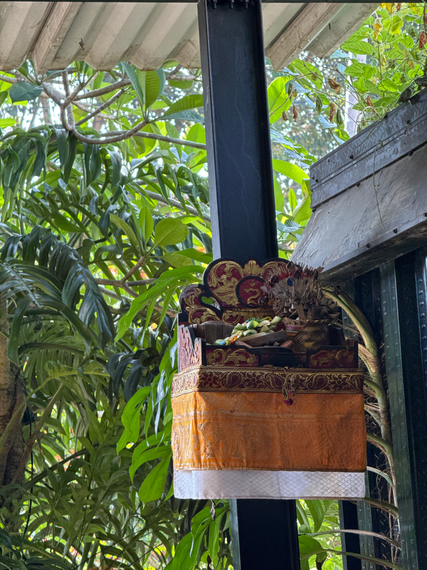 A low-angle medium shot shows a Balinese shrine with an orange and white cloth hanging off the side, affixed to a steel beam structure against a backdrop of dense green foliage. The shrine is ornate,…read more