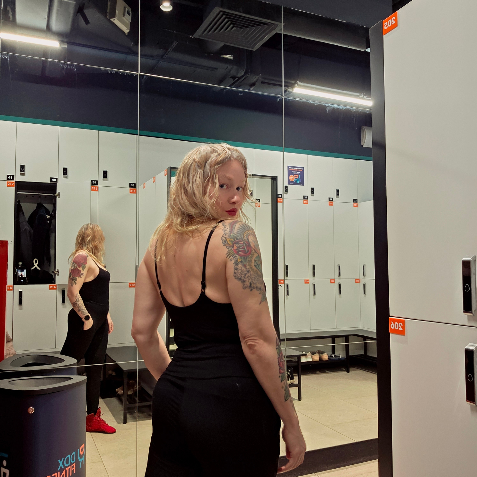 A photo taken at a fitness center in Saint Petersburg, Russia, shows a woman reflected in a mirror wall. The woman has blonde hair, fair skin, and is wearing a black dress. A visible tattoo decorates…read more