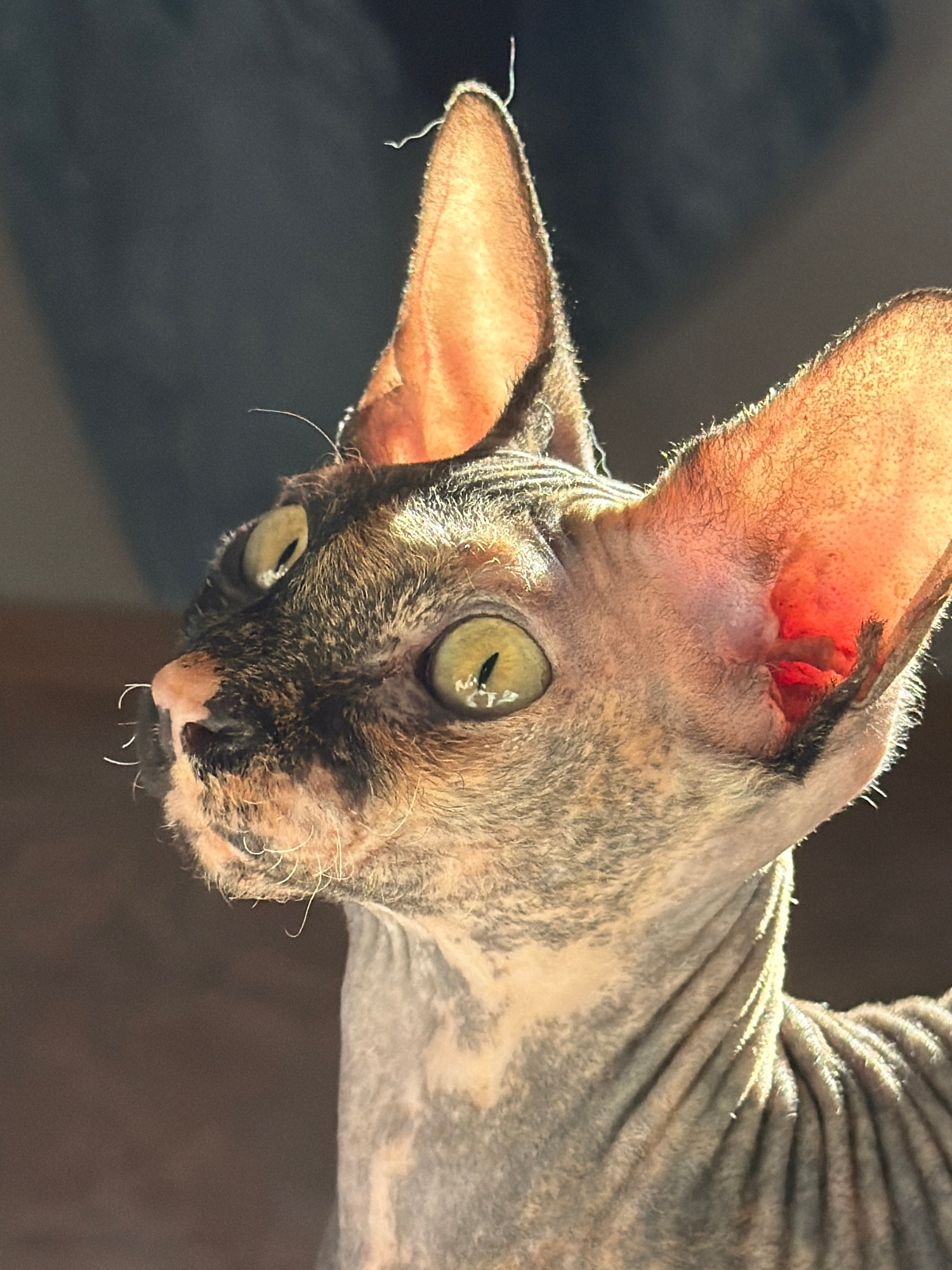 A close-up, upside-down perspective shows a hairless cat, likely a Sphynx, with mottled gray and brown skin. The cat's large, pointed ears are prominent, with the inner ear showing a pinkish hue. Its…read more