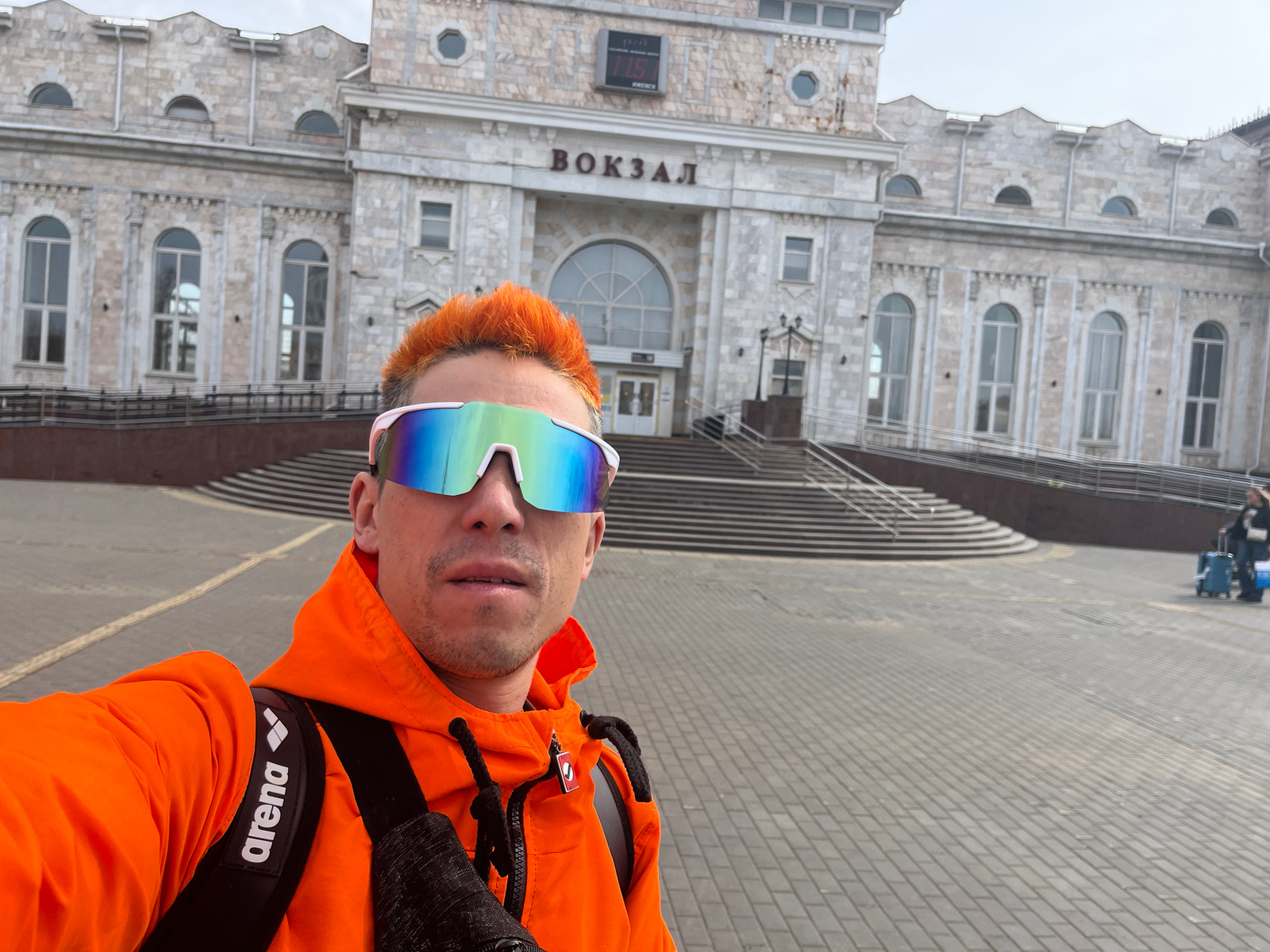 A person in an orange hoodie and futuristic sunglasses stands in front of the Izhevsk railway station in Russia. The building is made of light-colored stone with symmetrical windows and architectural…read more