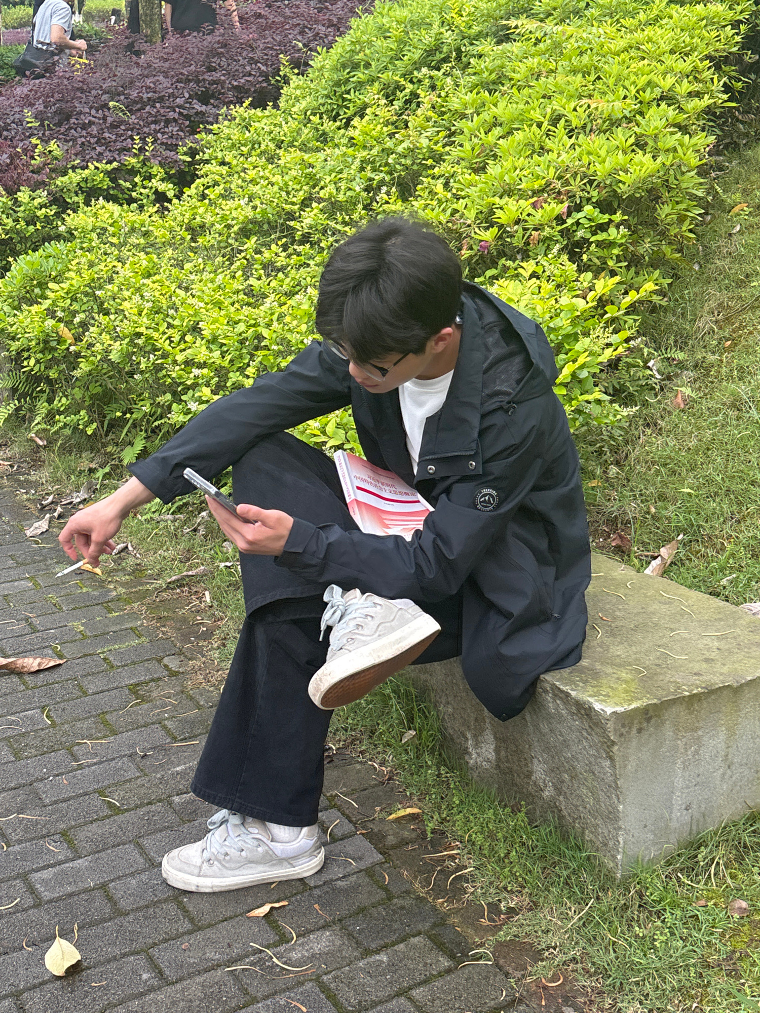 A person is crouching outdoors in a park-like setting. The individual has dark hair and is wearing glasses, a white t-shirt, a black jacket, and black pants. They are holding a book with red and white…read more