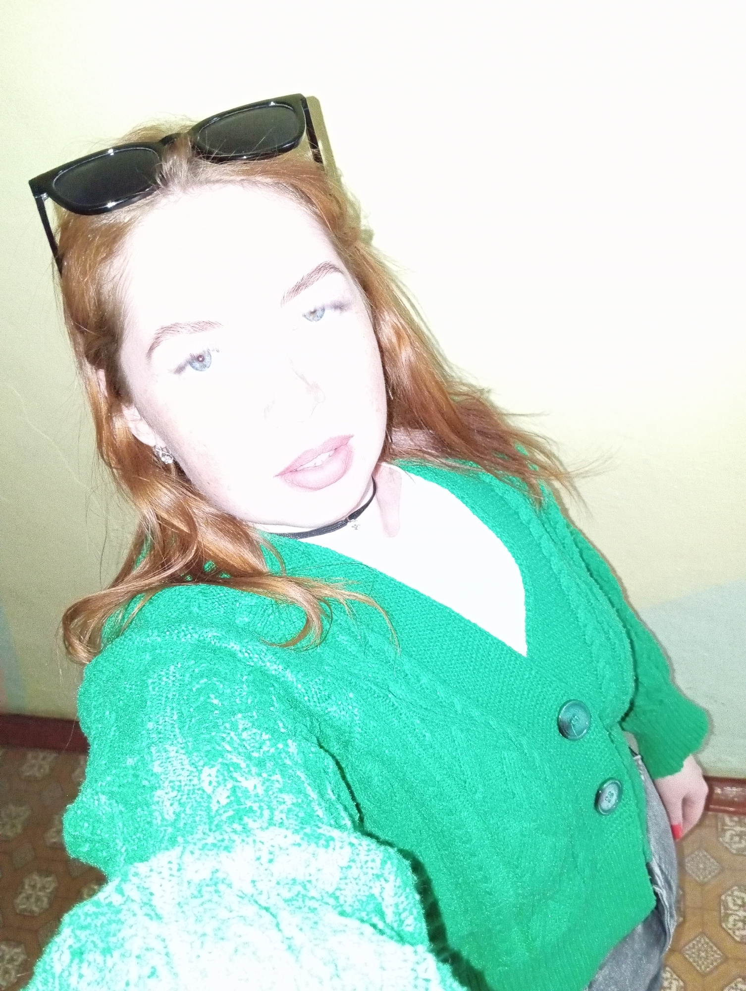A person with fair skin and light blue eyes, wearing a black choker necklace and a green knit sweater with large buttons, is seen from a close, slightly upward angle. A pair of black sunglasses rests…read more