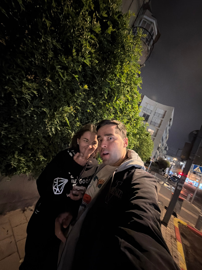 A low-angle, nighttime selfie captures two Caucasian adults on a sidewalk in Tel Aviv, Israel. The male subject, positioned in the foreground on the right, displays a wide-eyed, open-mouthed expressioβ¦read more