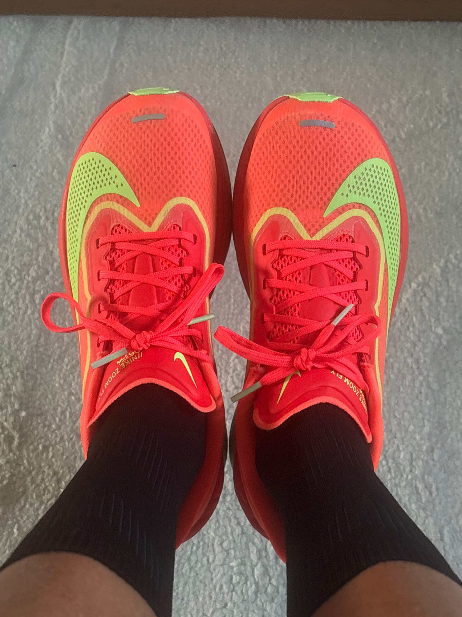 An overhead shot captures a person's feet, clad in black socks and bright running shoes, positioned on a light grey, textured floor, possibly indoors in Pétange, Luxembourg. The two shoes are identic…read more
