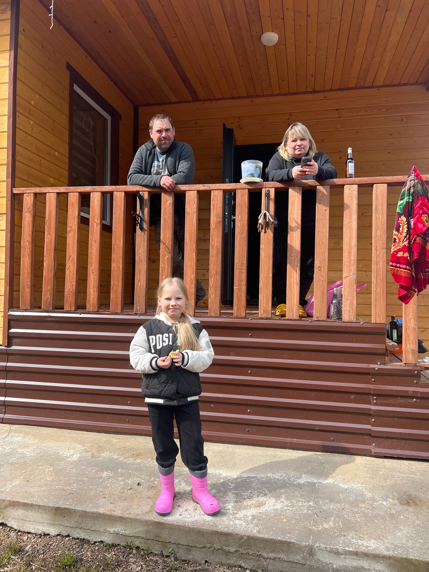 Scene: An outdoor shot featuring three individuals and a child, possibly a family gathering, set against the backdrop of a wooden structure, identified as being in Bol'shakino, Russia. People: - Two…read more