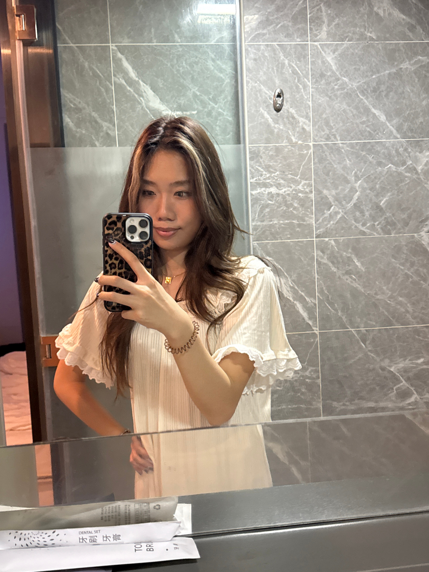 A woman with light brown hair with darker streaks is taking a selfie in a bathroom. She is holding a phone with a leopard print case in her left hand. The bathroom has grey marble-like tiles on the wa…read more