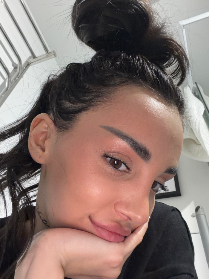 A woman poses with her face tilted. She has brown eyes and dark hair pulled into a bun. Her skin appears smooth, and her eyebrows are thick and well-defined. One hand supports her chin. A towel rack i…read more