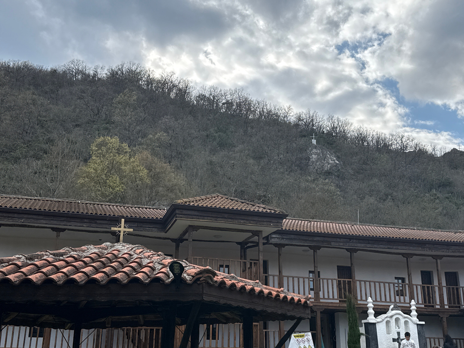 The image shows a building with a red-tiled roof, featuring crosses on top. The building has a white exterior and a wooden balcony. In the background is a tree-covered hill, and a large white cross si…read more