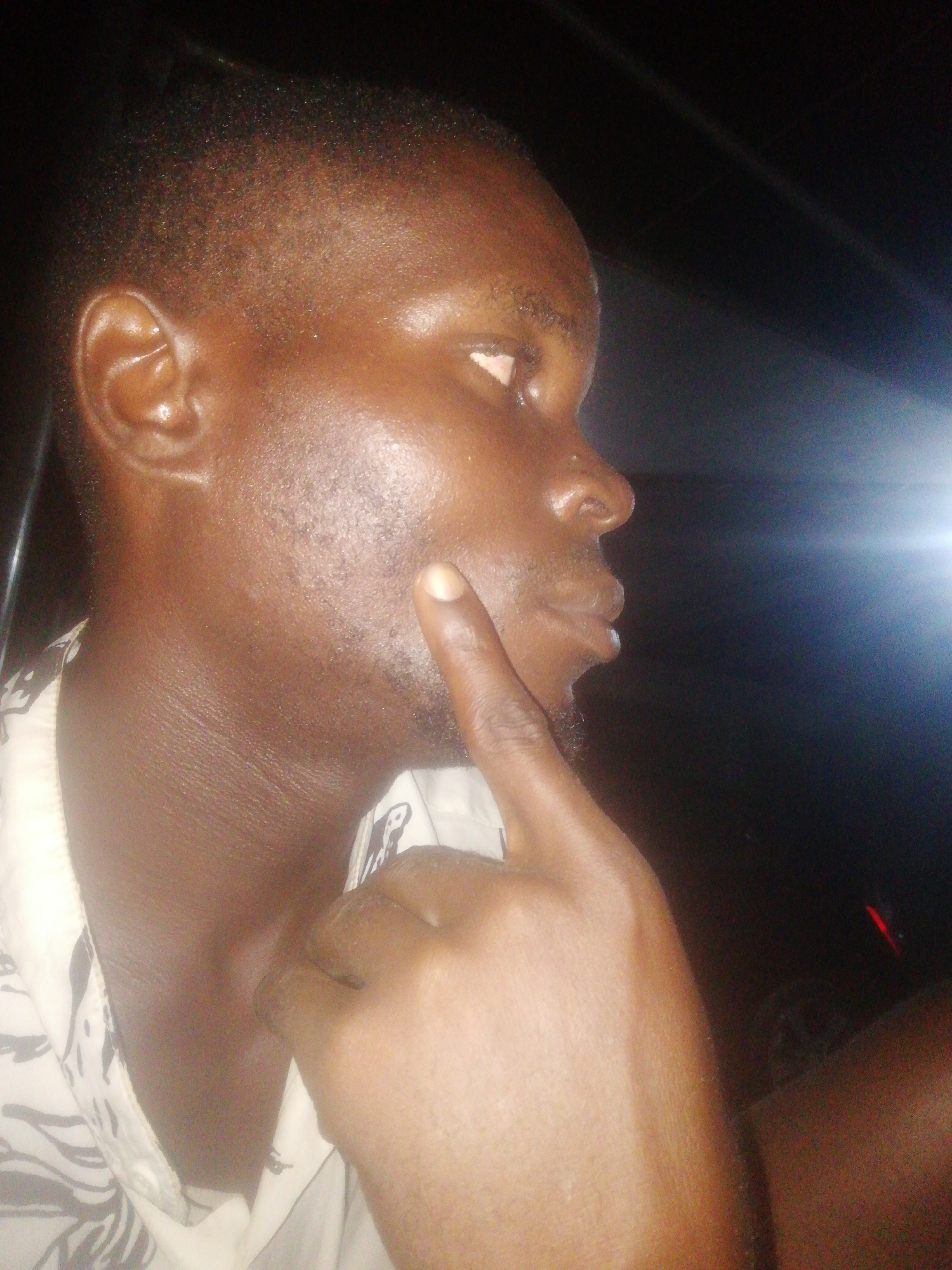 A close-up, side-profile shot shows a dark-skinned man with a closely cropped haircut. He is resting his index finger against his chin. The background is dark with a bright light source off-camera. Itβ¦read more