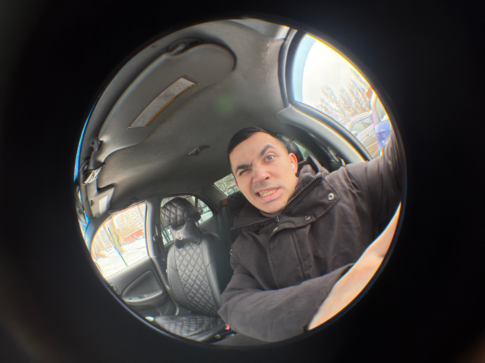 The image shows a fisheye view inside a car. A man wearing a dark brown jacket is in the driver's seat, winking and grimacing at the camera. The interior of the car is visible, including the front sea…read more