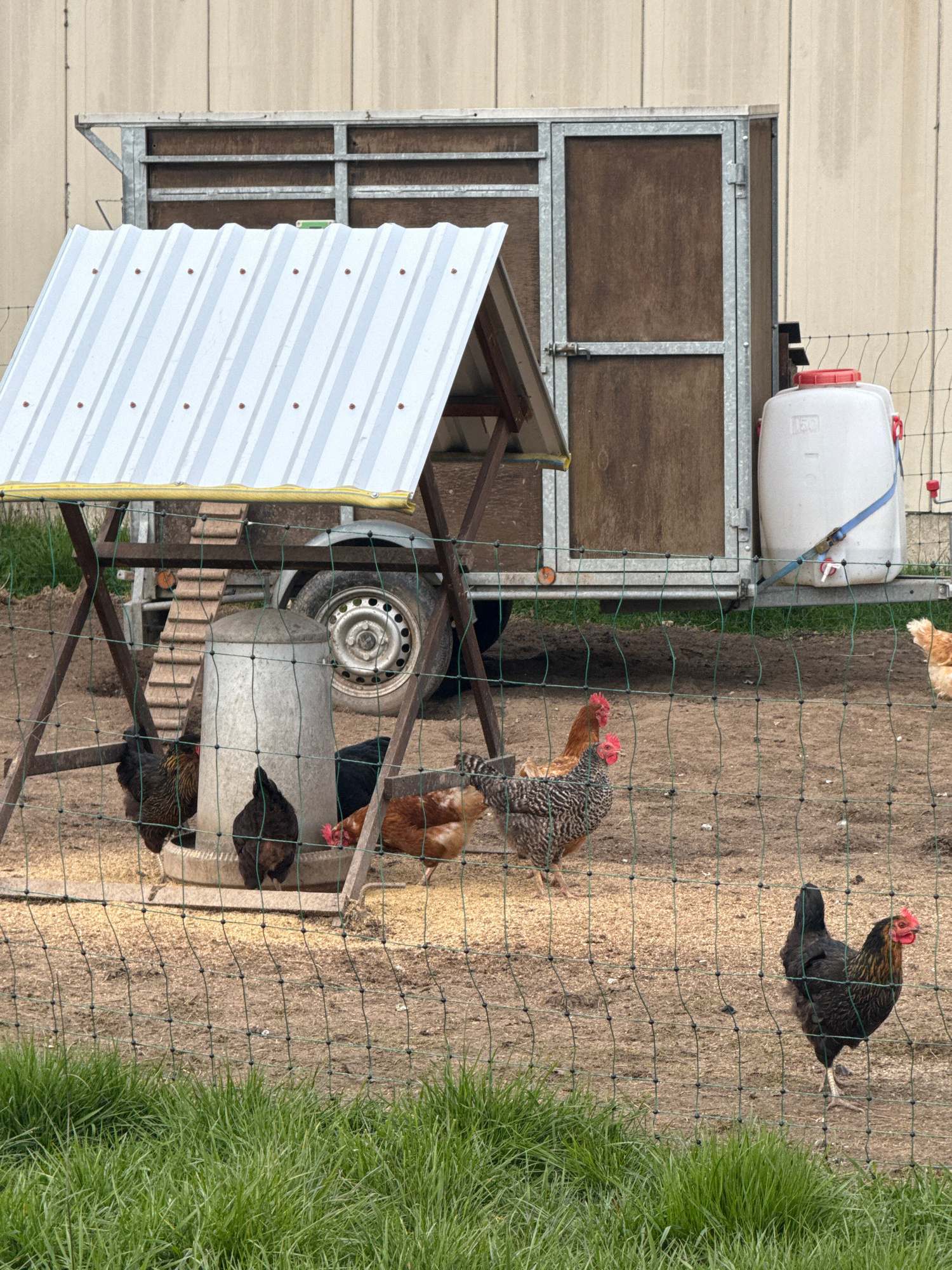 The image depicts a chicken coop with multiple chickens inside and outside the enclosure in Junglinster, Luxembourg. The coop appears to be mobile, built on a trailer with a visible wheel. It has a co…read more