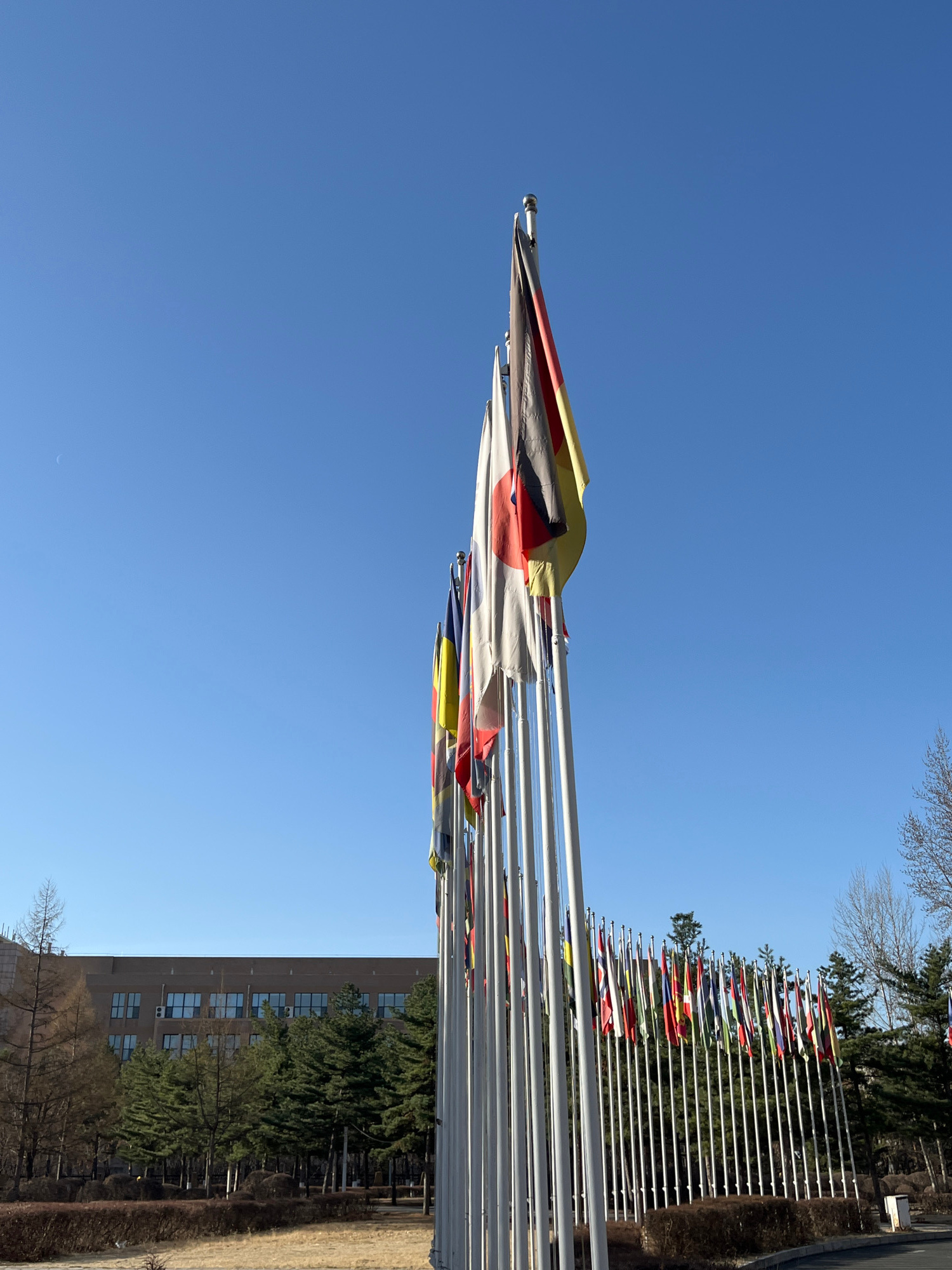 The image shows a row of flagpoles with various international flags unfurled, under a clear blue sky. The flags are positioned in front of a tan-colored building with multiple windows and tree cover.…read more