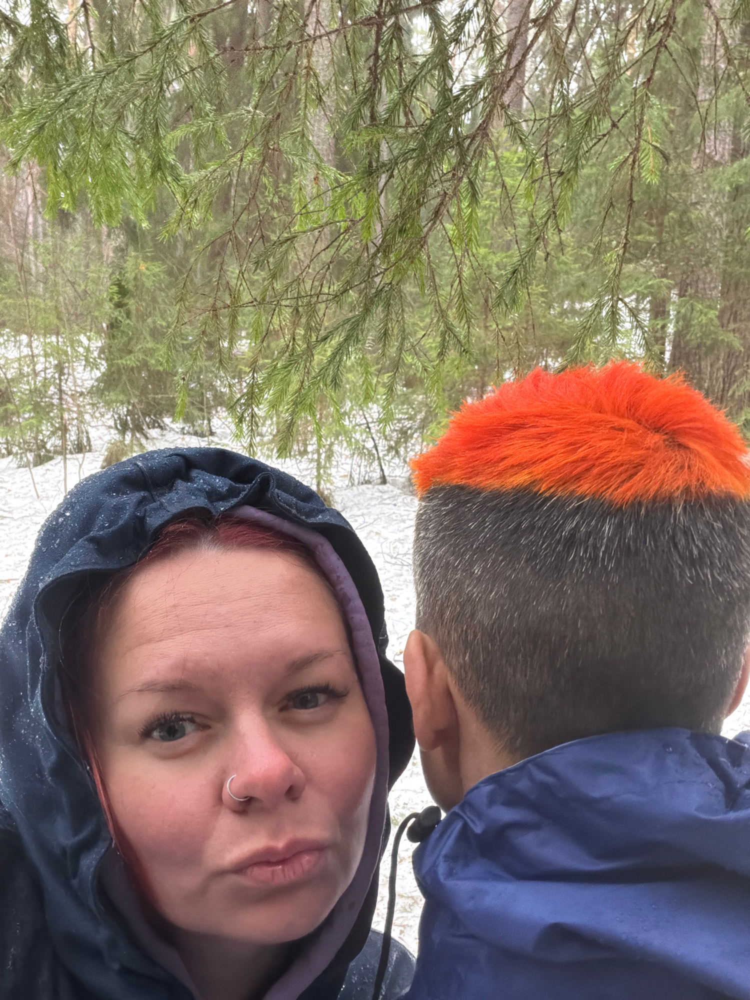 A selfie of two people in a snowy, wooded outdoor setting. A person with a gray and orange haircut and a blue jacket is positioned at the top of the frame. Another person with auburn hair partially vi…read more