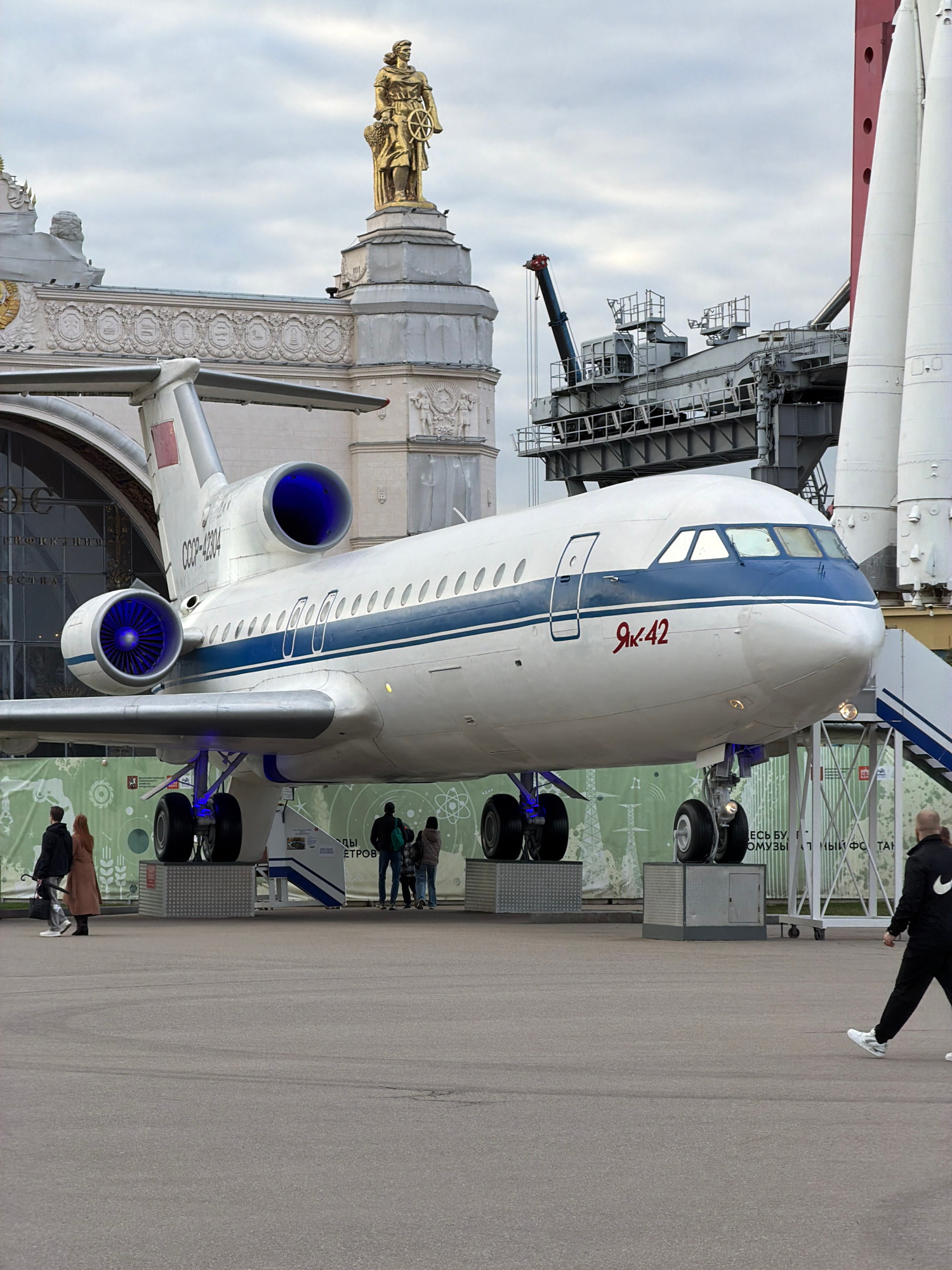 The image shows a Yak-42 airplane on display at the VDNKh (Exhibition of Achievements of National Economy) in Moscow, Russia. The plane is white with a blue stripe. The "Yak-42" is written on the nose…read more