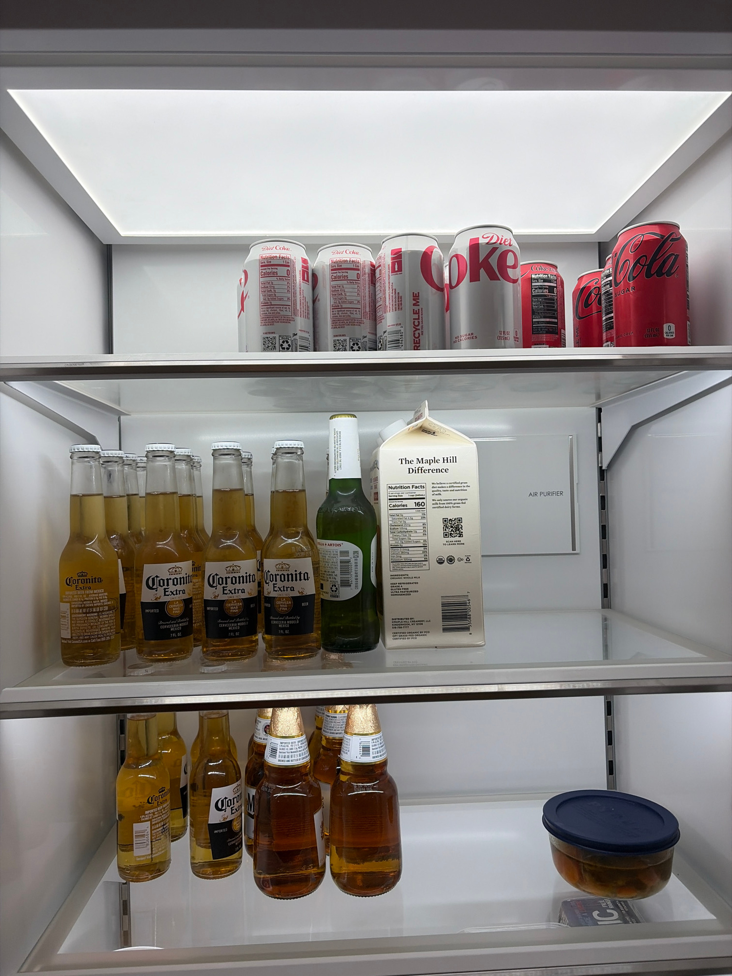 This is a photograph taken inside a refrigerator. The refrigerator has three sections, each filled with different items. The left section is stacked with cans of Coca-Cola and Diet Coke. The middle se…read more