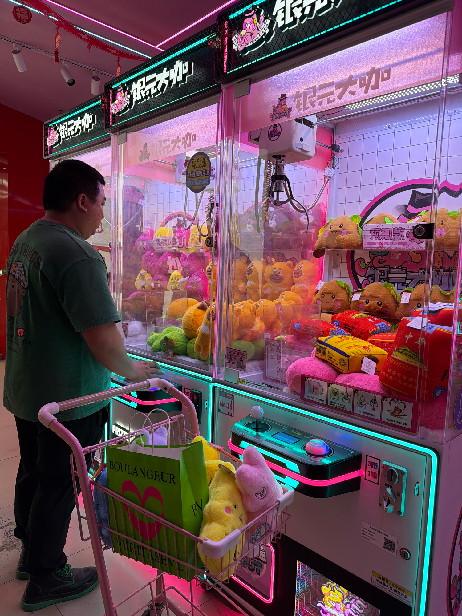 A person is standing in front of a claw machine in an arcade or entertainment venue in Chongqing High-tech Zone, China. The claw machine is filled with stuffed toys of various colors and shapes. The p…read more