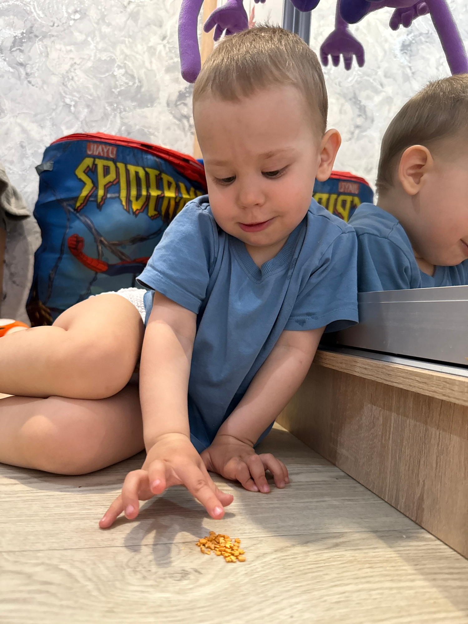 A toddler sits on a light-colored wooden floor next to a wooden cabinet or dresser. Scattered on the floor are small, yellowish-brown objects. The toddler, wearing a blue T-shirt and a diaper, is posi…read more