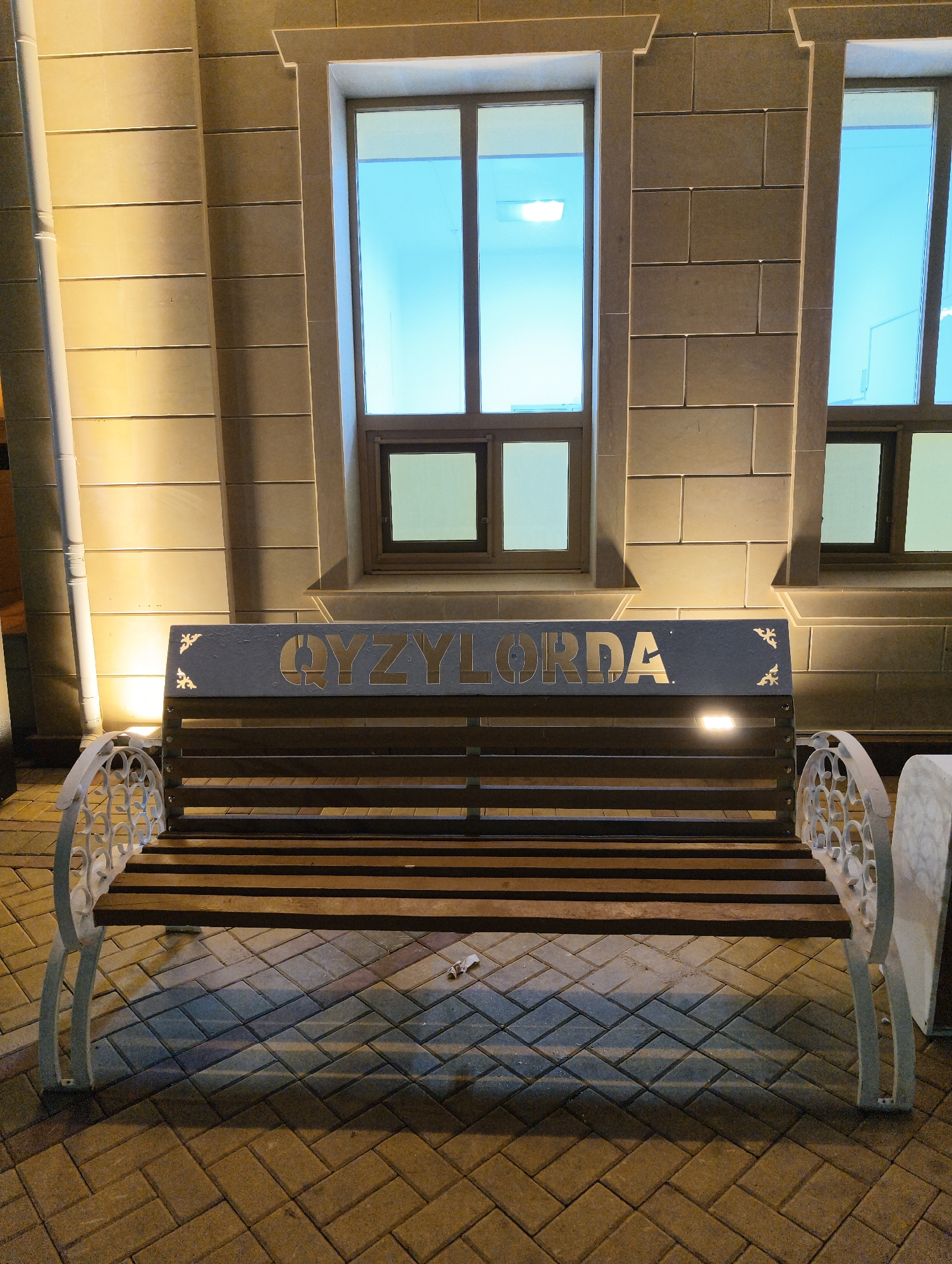 A straight-on shot depicts a city bench with the name "QYZYLORDA" cut out across the top panel. The bench has a dark wooden seat with light-colored metal armrests featuring a repeating circular patter…read more