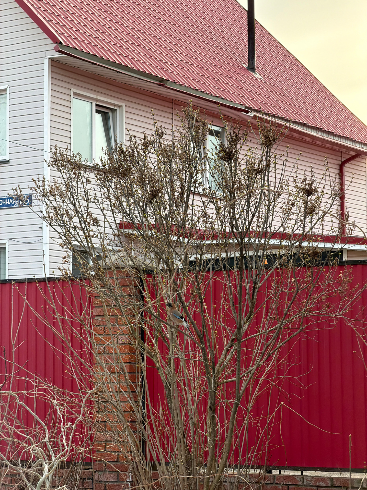The image depicts a building exterior with a red roof and pink siding, partially obscured by bare tree branches. On the lower left, there is a street sign in Russian that reads "Солнечная", which tran…read more