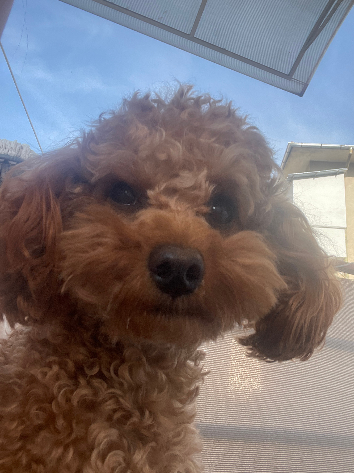 A low-angle, upward-facing close-up photograph captures the face of a small, brown, curly-haired dog, likely a poodle or doodle. The dog's dark, attentive eyes and prominent black nose are centered in…read more
