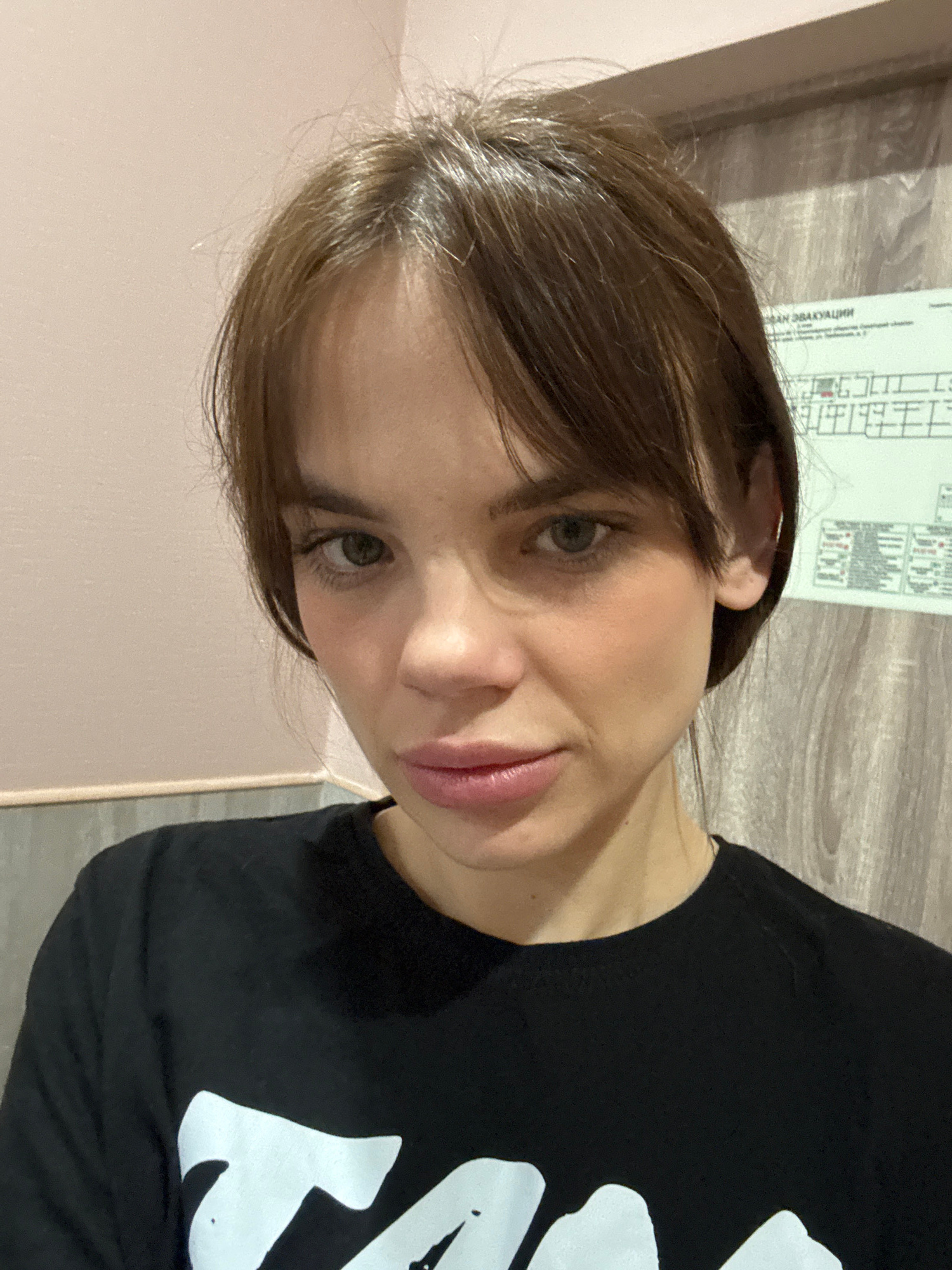 A medium shot shows a woman with brown hair and green eyes looking at the camera. She is wearing a black t-shirt with white designs. The background features a light pink wall on the left and a wall wi…read more