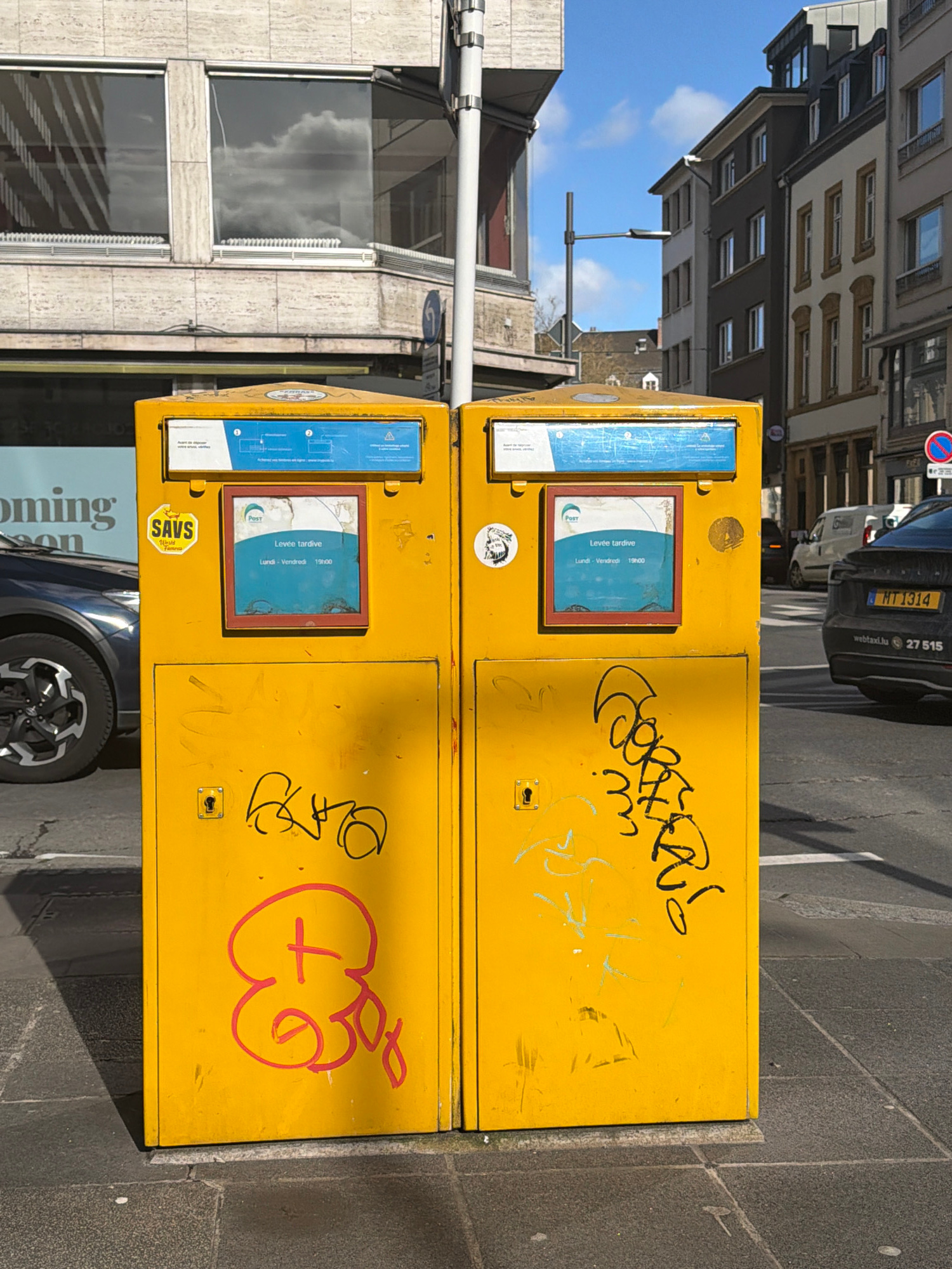 Two weathered, tall, rectangular yellow Post Luxembourg collection boxes stand side-by-side on a dark grey tiled pavement in a street in Luxembourg City, Luxembourg. Each box features a blue instructi…read more