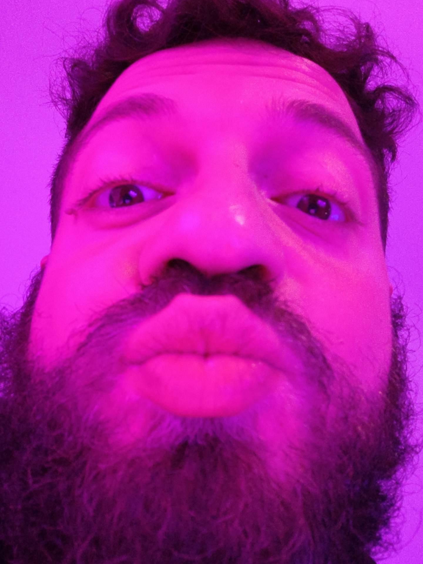 A close-up selfie of a man's face, lit with a strong pink light, obscuring skin tone and details. He has dark hair, a full beard, and a mustache. His lips are pursed. No information about the city of…read more
