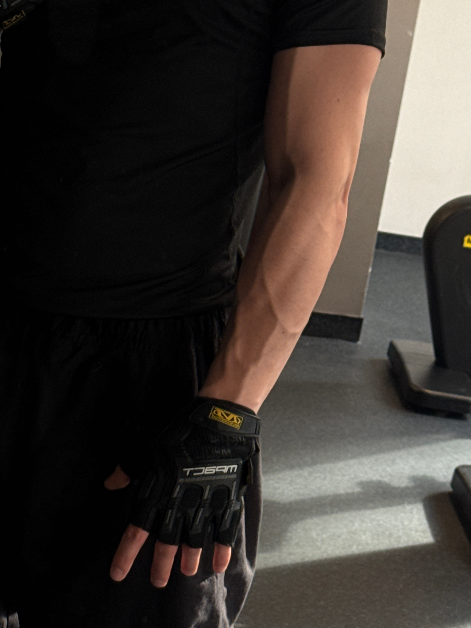 The image depicts the upper body and right arm of an individual inside what appears to be a gym in Sofia, Bulgaria. The subject is wearing a black short-sleeved athletic shirt and dark athletic shorts…read more
