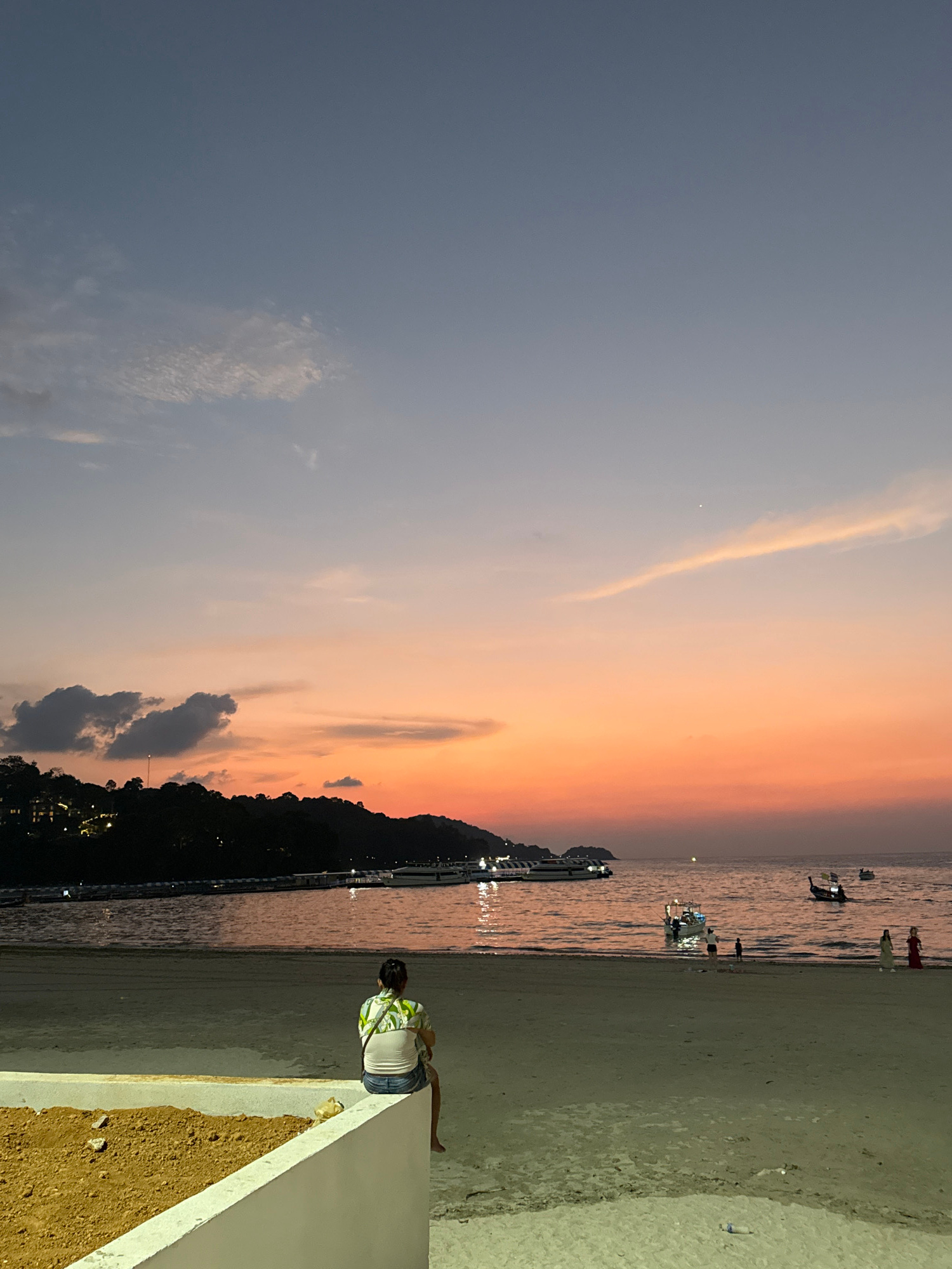The image depicts a beach scene at dusk, likely in Patong, Thailand, based on the beach features. The sky is a gradient of blue to orange, indicating a sunset or sunrise. A silhouette of a tree-covere…read more