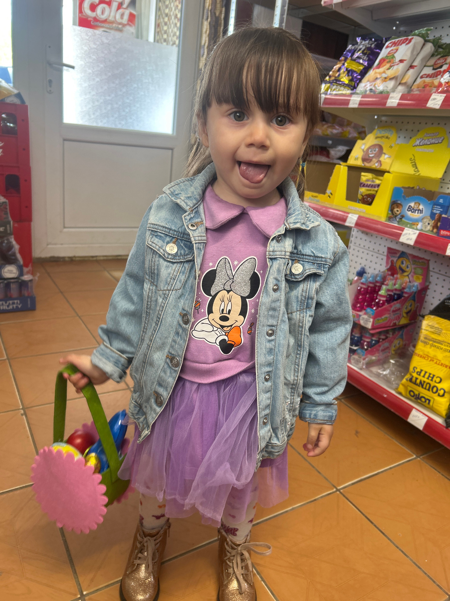 A young girl with brown hair is seen standing inside a store. She is wearing a lavender dress with a denim jacket over it, and sparkly gold boots. She holds a toy basket in her hand. Behind her, shelv…read more