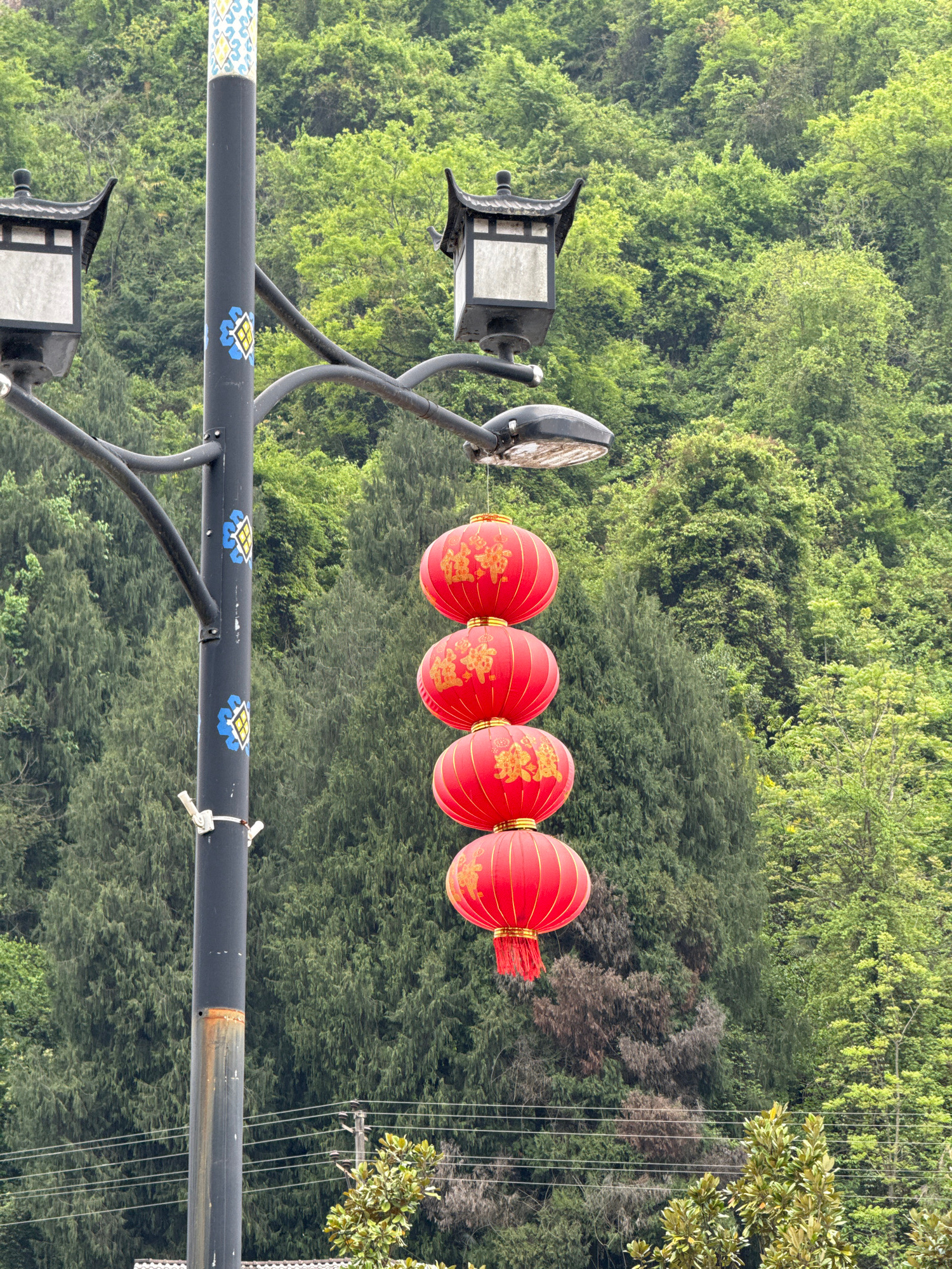 This image captures a decorative street light pole set against a backdrop of dense, green foliage. The pole, dark gray or black, features a horizontal crossbar from which four vibrant red Chinese lant…read more