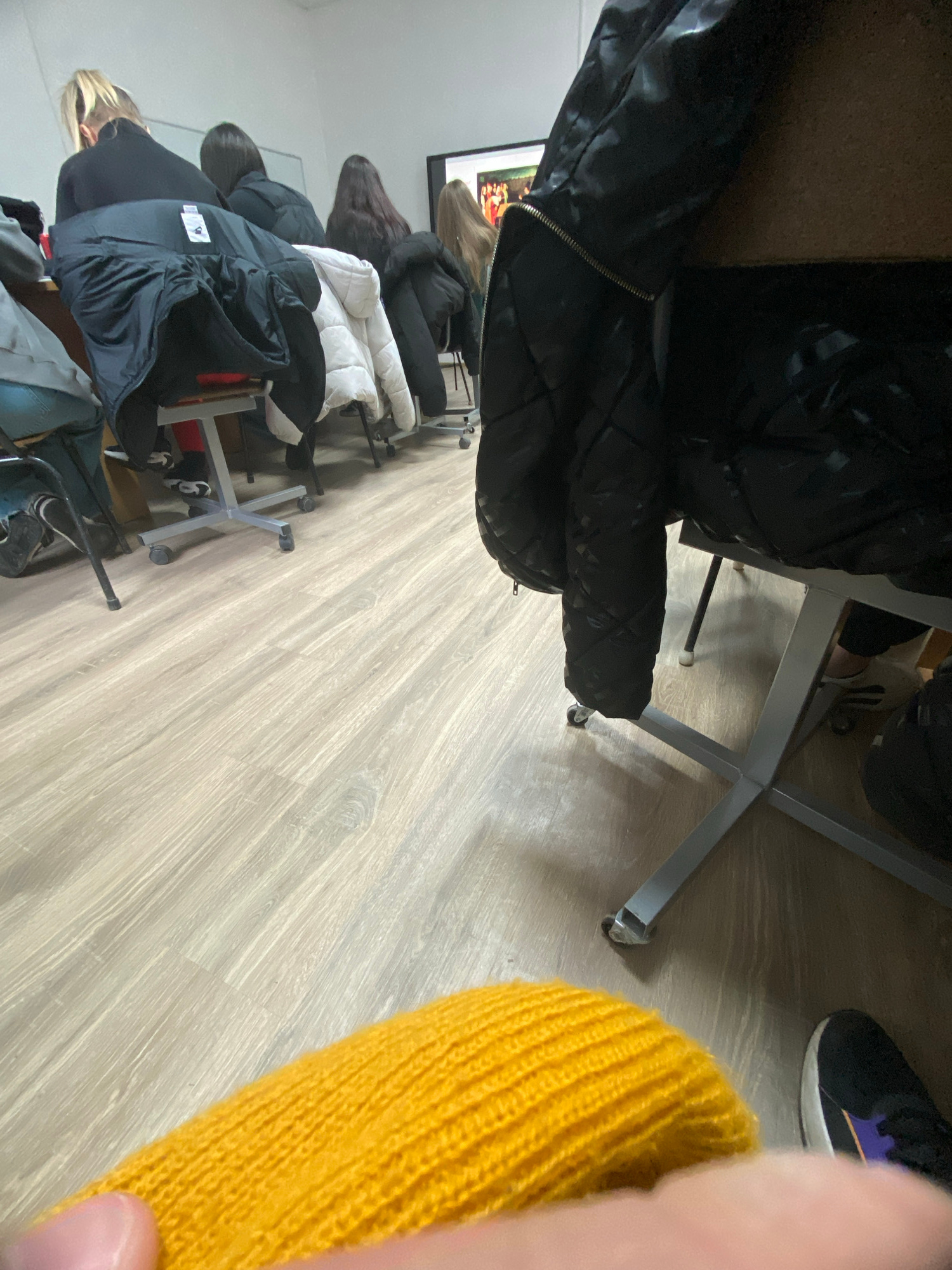 The image depicts a room with a light-colored, wood-grained floor. Several coats of varying colors (black, white, brown) are hanging on the backs of chairs that are lined up against the wall. Each chair is a standard office chair with a metal base and casters. In the upper right corner, a black sneaker with a purple accent and a yellow knitted object are visible. A partial view of a person is on the left side of the photo. The specific location in the city of Troyan, Bulgaria, is not discernible from the image. The photo contains chairs, jackets and people. The people are hanging jackets on the backs of the chairs. | Open Wire