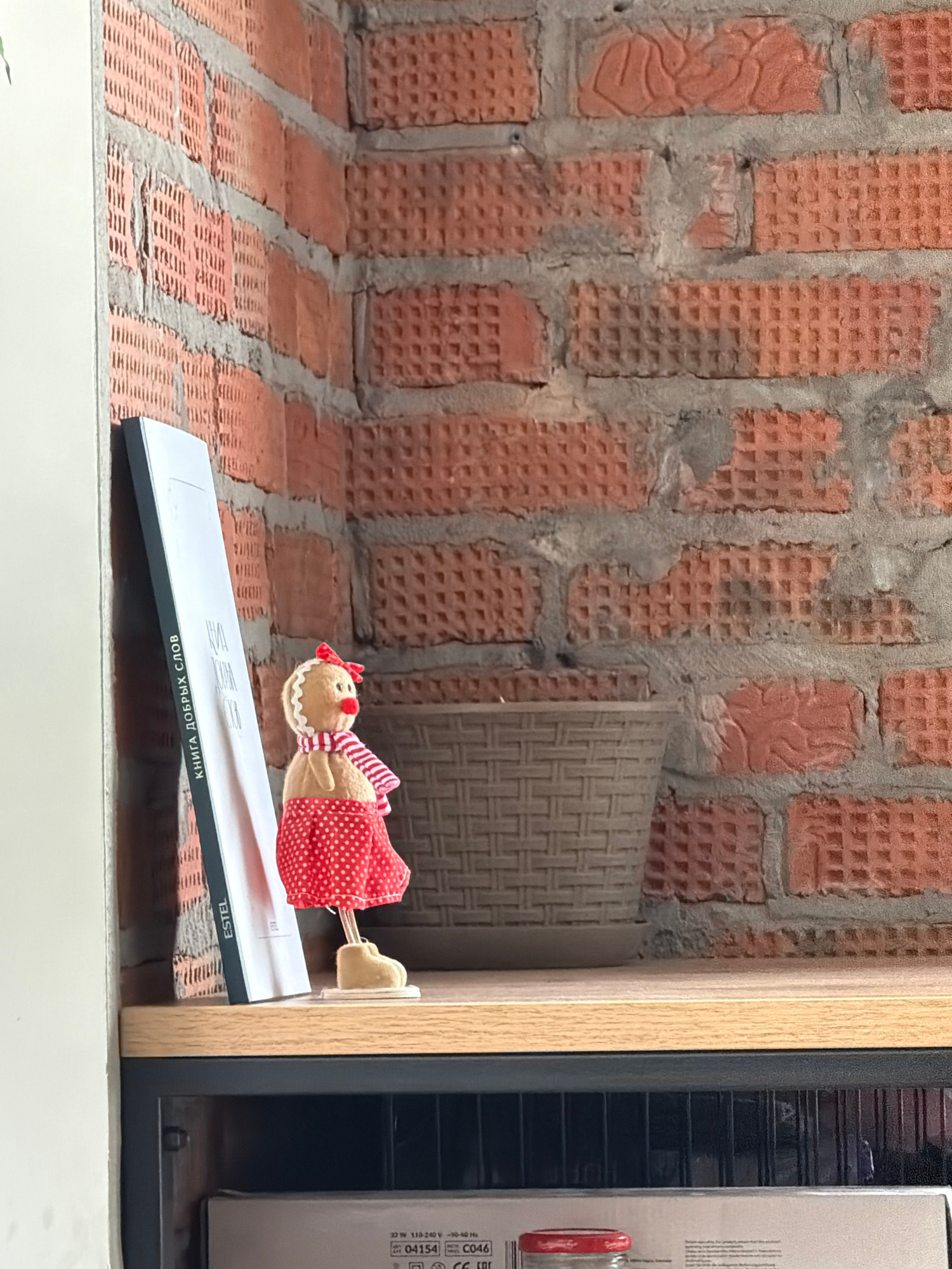 A gingerbread person doll sits on a white rectangular object with text in Russian that translates to "Book of Good Words" resting on a shelf within a wooden cabinet in front of a red brick wall. The s…read more